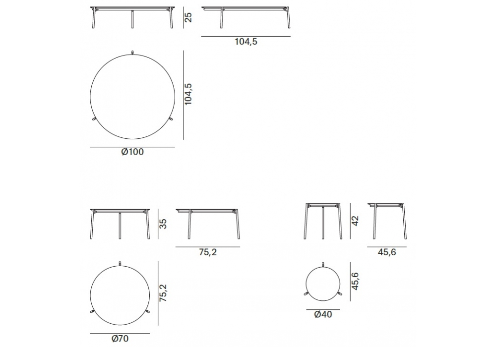 | Dimensiones | Ø 100 x H 25 cm; Ø 70 x H 35 cm; Ø 40 x H 42 cm. |