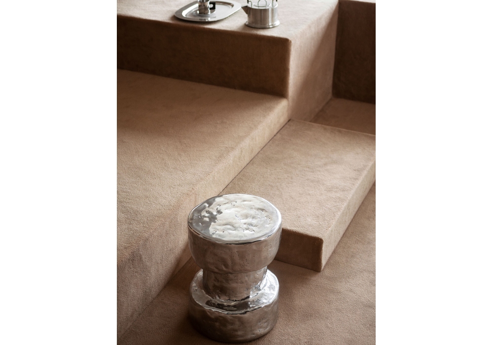 Torso diseñada por Roberto Sironi para Tacchini es una mesa auxiliar de aluminio cromado pulido.