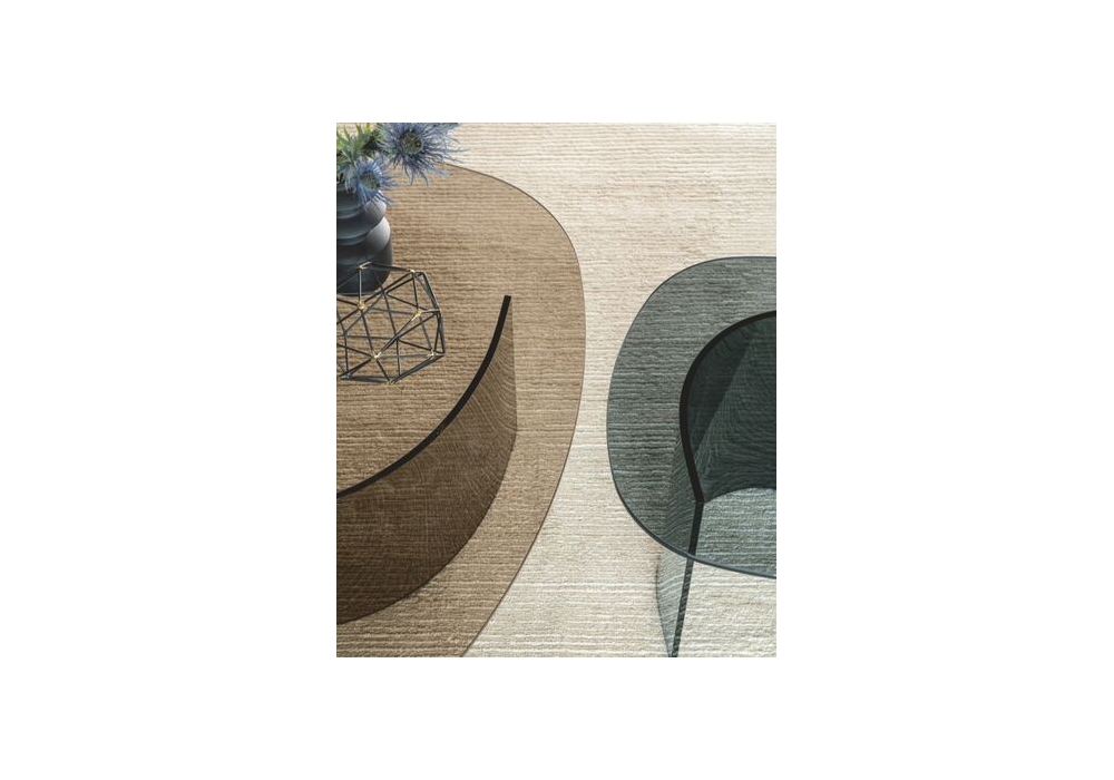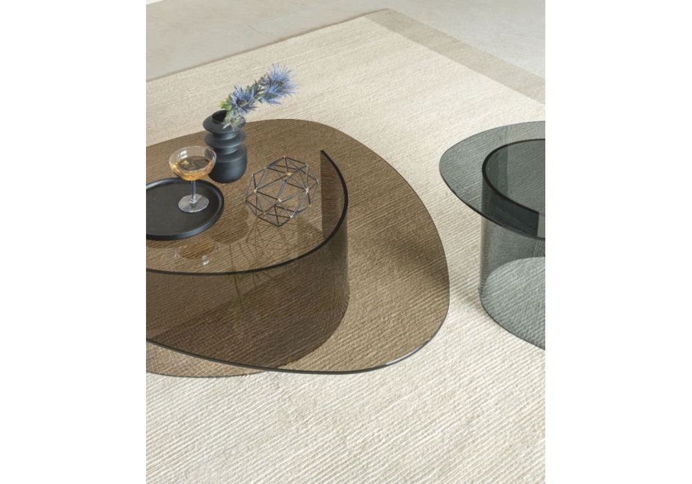 Crystal diseñada por Riflessi es una mesita de vidrio transparente curvado y soldado. Disponible en diferentes acabados y dimensiones.