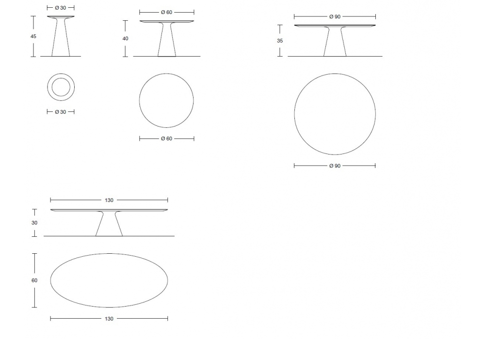| Dimensiones | Ø 30 x H 45 cm; Ø 60 x H 40 cm; Ø 90 x H 35 cm; 130 x 60 x H 30 cm. |