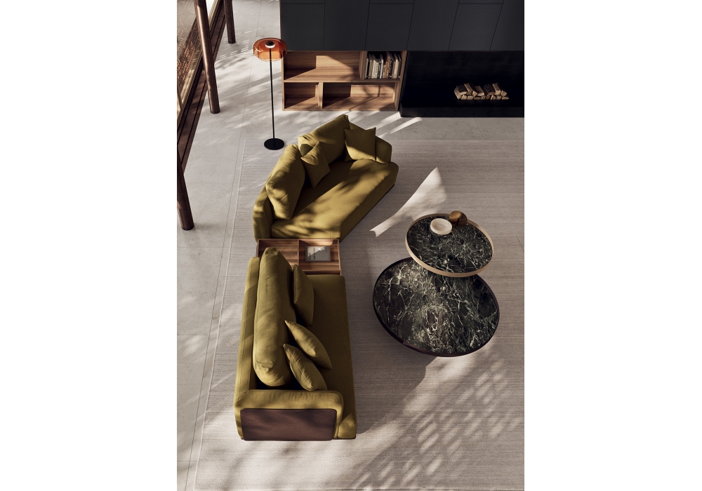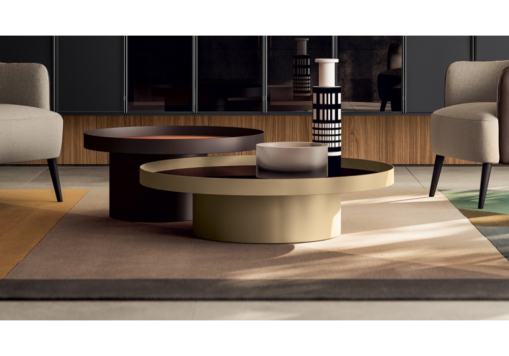Ninfea diseñada por Kico es una mesita con estructura cilíndrica de metal y tablero de gres, vidrio, madera o espejo. Disponible en diferentes acabados y dimensiones.
