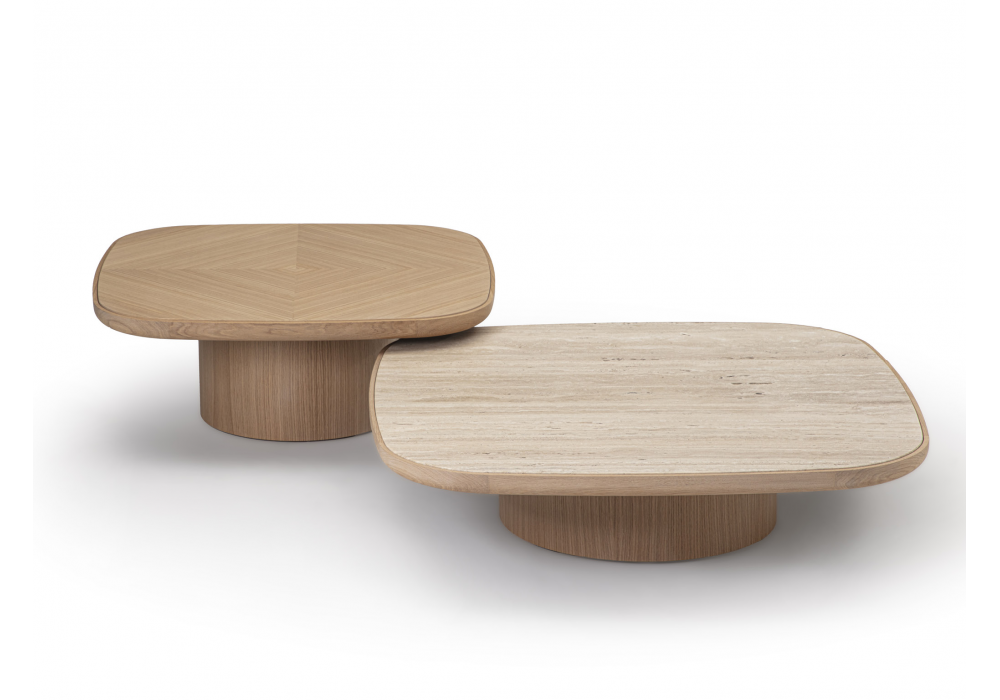 Enook diseñada por Maurizio Marconato y Terry Zappa para Porada es una mesita con una base curva de madera contrachapada y una estructura de roble macizo. La superficie de roble presenta una incrustación radial.