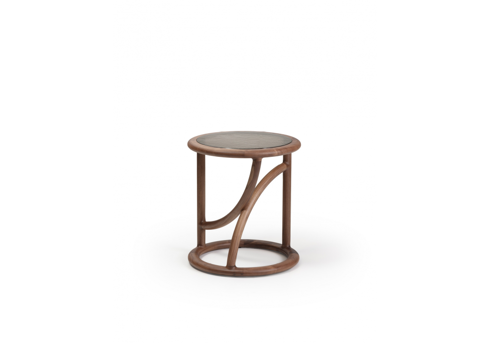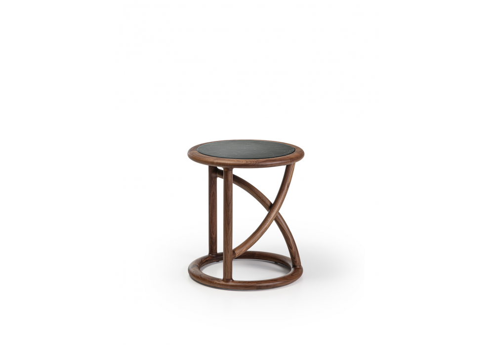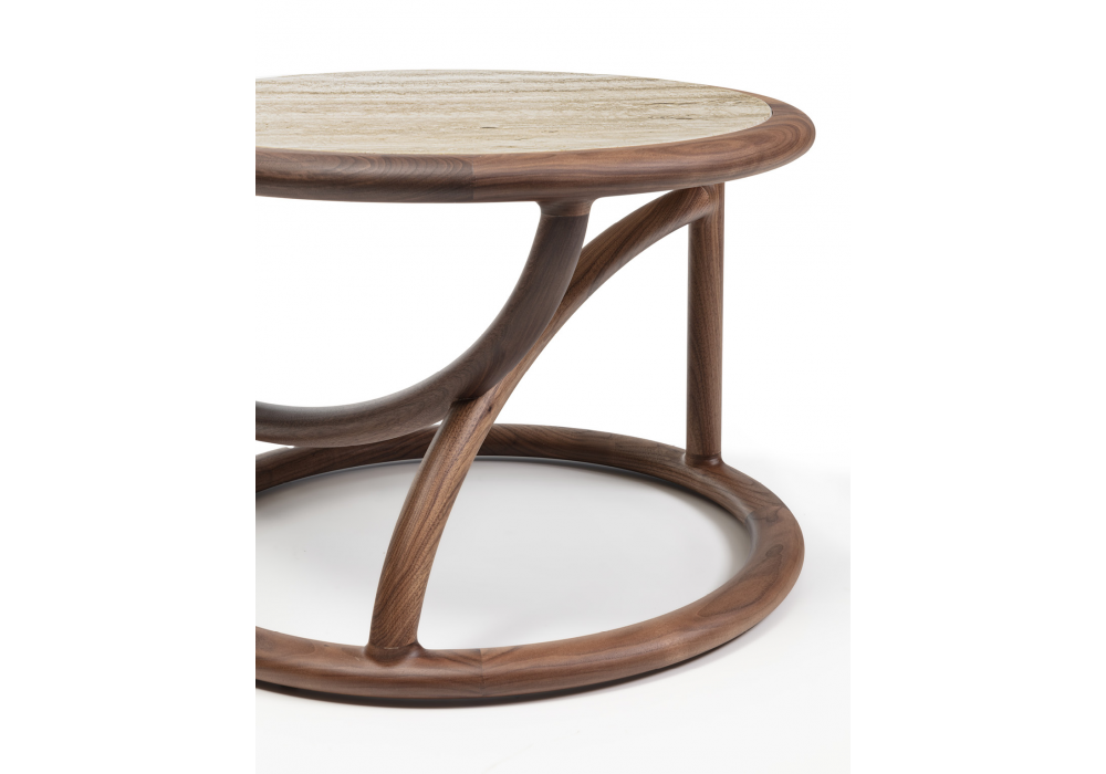 Flip diseñada por Andrea Radice para Porada es una mesita con una sólida estructura de nogal canaletta y una tapa de mármol o vidrio termoformado con acabado Terre.