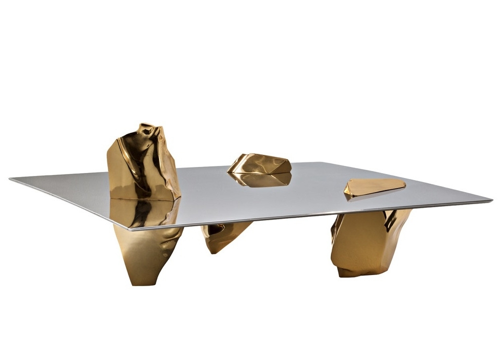 Sereno diseñada por Fredrikson Stallard para Driade es una mesa de centro escultórica con acabado metálico realizada con tecnología Sputtering en titanio y oro. Tapa en partículas de madera de 18 mm de espesor. recubierta de gruesa chapa de acero inoxidable pulido espejo. Solo para uso interno.