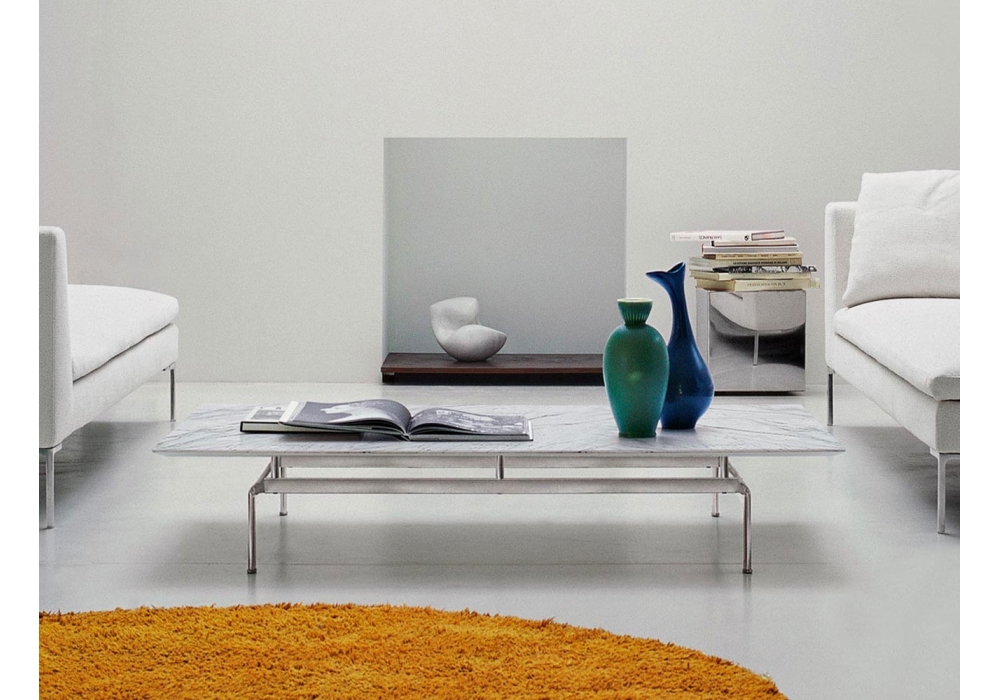 Diesis diseñada por Antonio Citterio & Paolo Nava para B&B Italia es una mesa baja con tablero de mármol, estructura de aluminio cepillado pulido o aluminio cromado negro. Patas de aluminio cepillado mate.