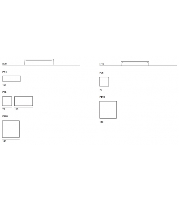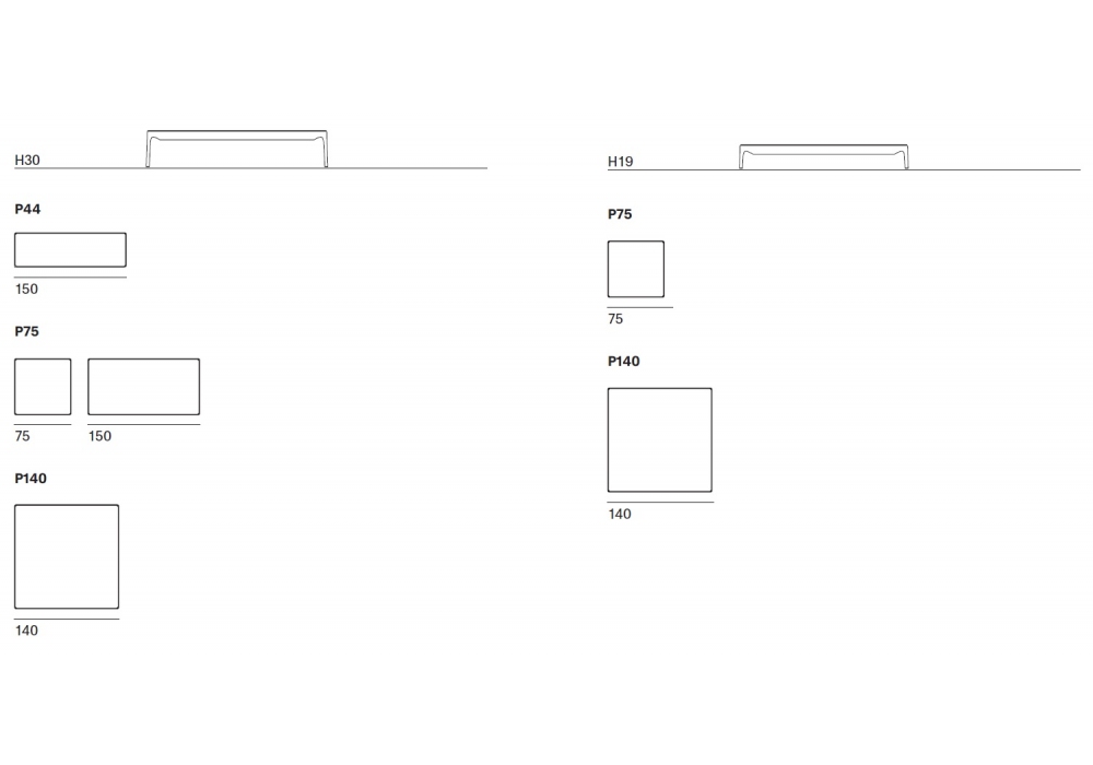 | Dimensiones | 44 x 150 x H 30 cm; 75 x 150 x H 30 cm; 75 x 75 x H 30 cm; 75 x 75 x H 19 cm; 140 x 140 x H 19 cm; 140 x 140 x H 30 cm. |