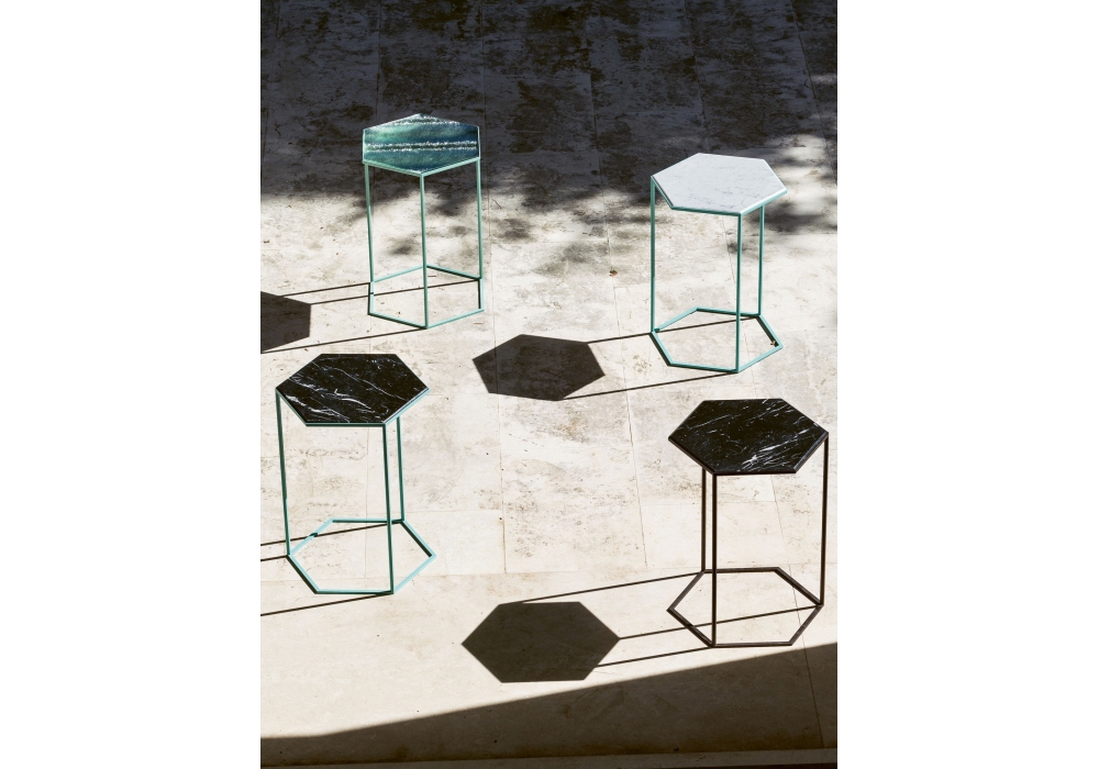 A perfect little side companion. The Hexxed table completes the 2014 metal collection which focuses on clean lines, nice details like the hexagon tubing and special finishes. Coming in 2 heights and three color combinations. The powder coated Vintage Copper, Polished Copper and Matt Black are finish with white or black marble tops.