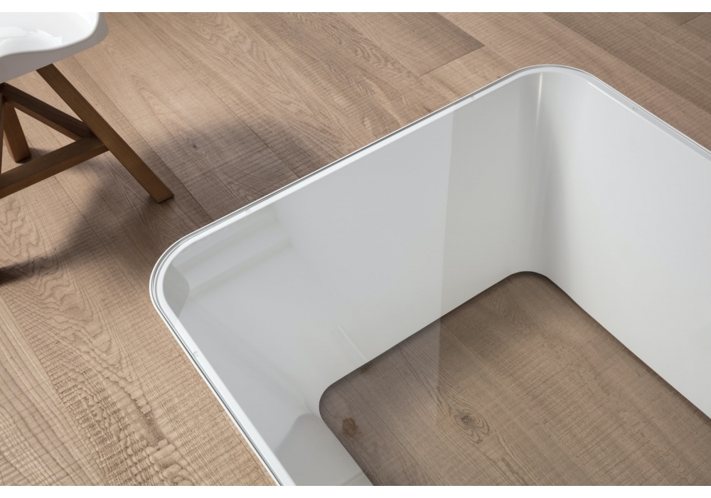 Zero-In diseñada por Barber & Osgerby para Established & Sons es una mesita con estructura de poliéster moldeada en una sola pieza sin soldaduras recubierta por un cristal transparente de 4mm. Disponible en diferentes acabados.