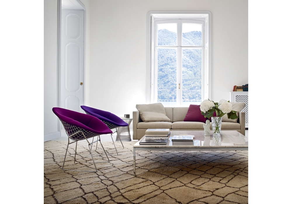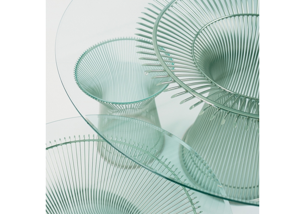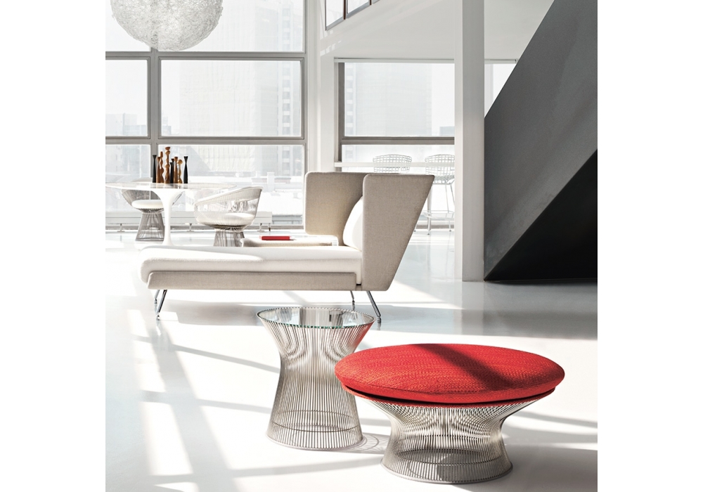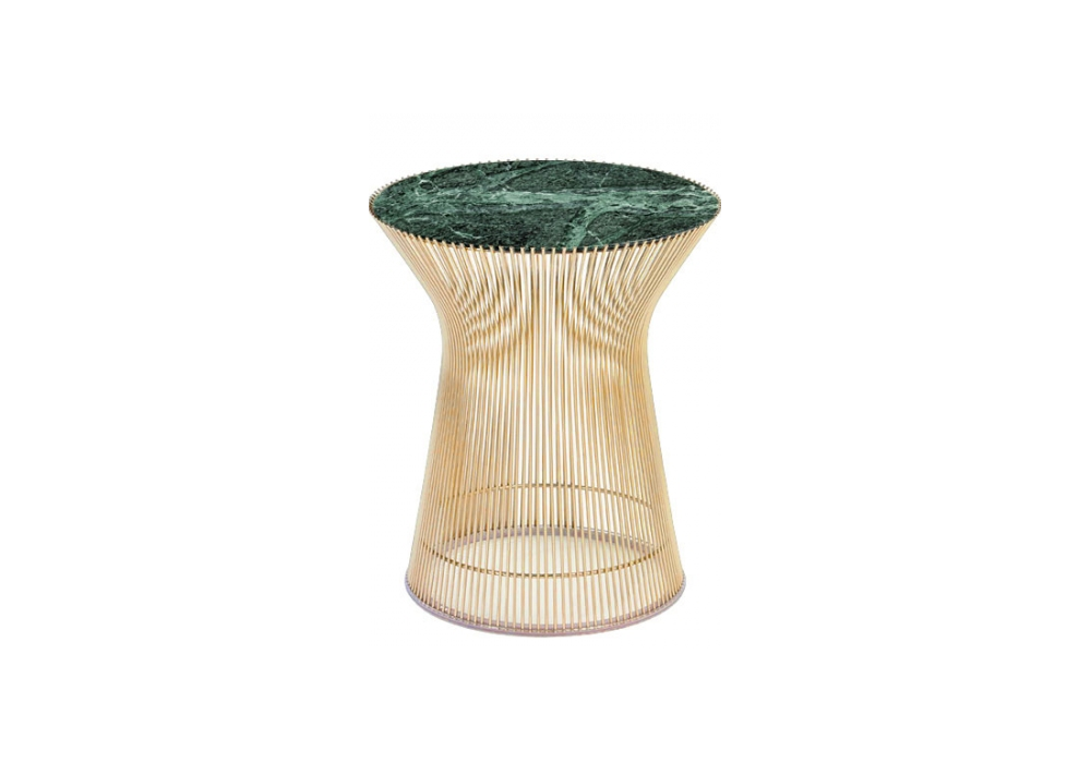 Platner diseñada por Warren Platner para Knoll es una mesita con estructura de varillas metálicas perfiladas vertical y horizontalmente, con baño de níquel y acabado protector transparente, bronce u oro de 18k. Tablero en cristal con cantos biselados o mármol en varios acabados.