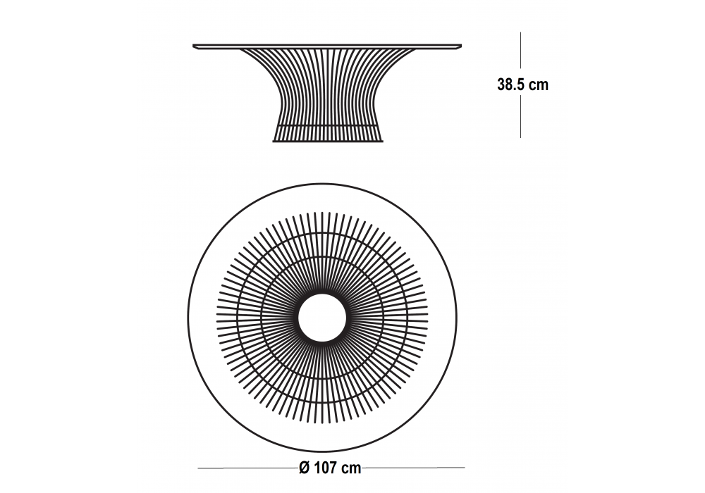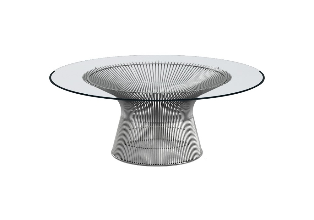 Platner diseñada por Warren Platner para Knoll es una mesa baja de grandes dimensiones con estructura de varillas metálicas perfiladas vertical y horizontalmente, con baño de níquel y acabado protector transparente, bronce u oro de 18k. Tablero en cristal con cantos biselados o mármol en varios acabados.