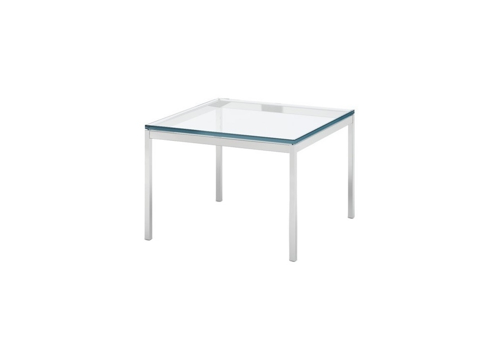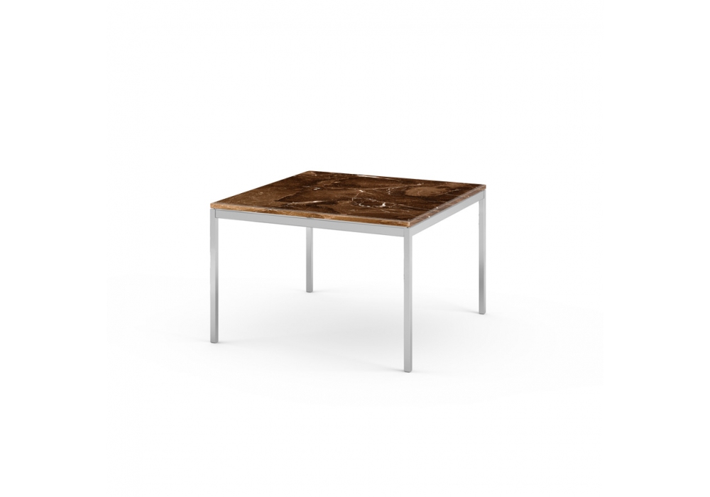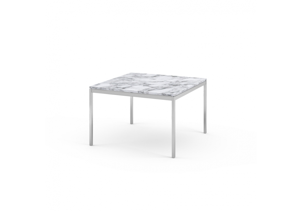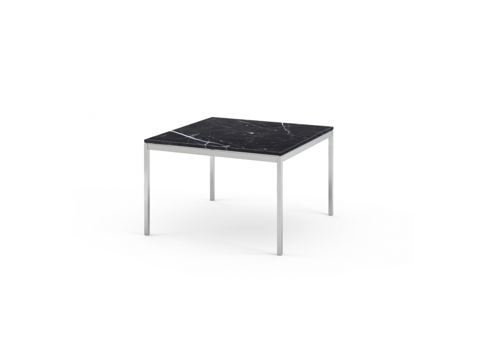 Florence diseñada por Florence Knoll para Knoll es una mesa de centro cuadrada con estructura de acero soldado, cromado brillante o pintado de color negro. Tablero de mármol, cristal transparente o madera de roble.