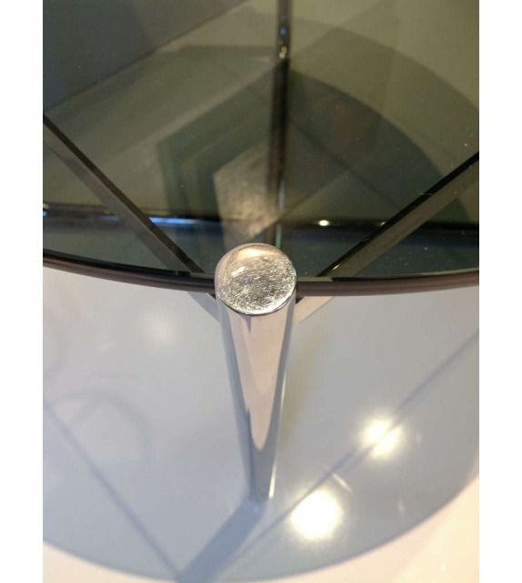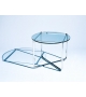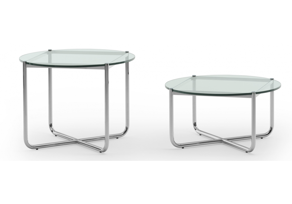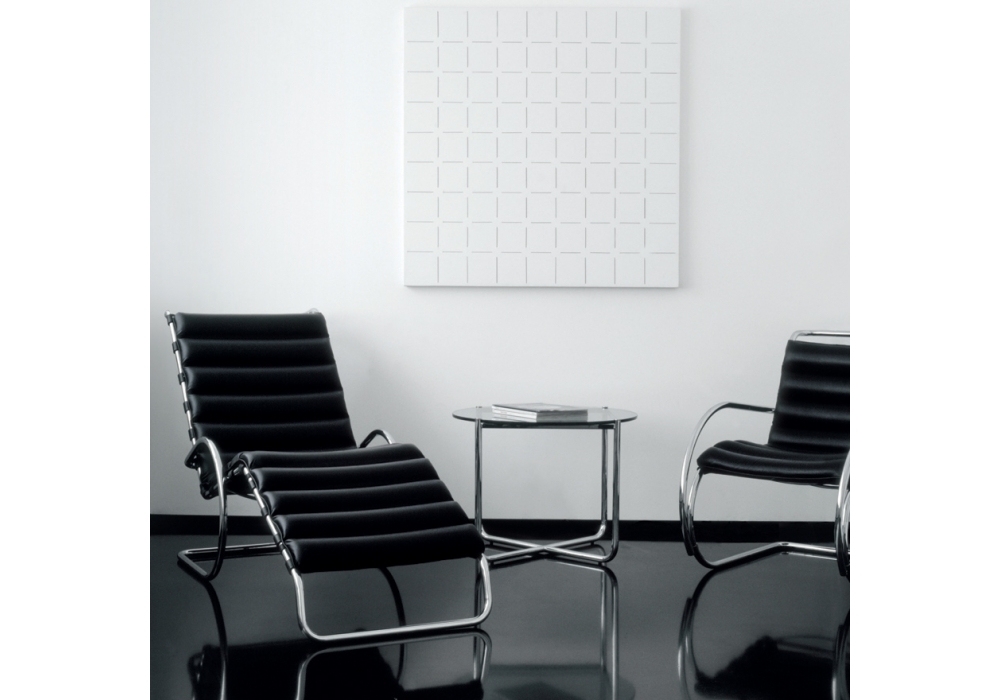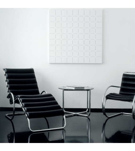 MR diseñada por Mies van der Rohe para Knoll es una mesa de centro con estructura de tubo de acero de sección redonda en acabado acero cromado o con pintura epoxi mate en color ónix, blanco o rojo oscuro. Tablero de cristal transparente o negro.
