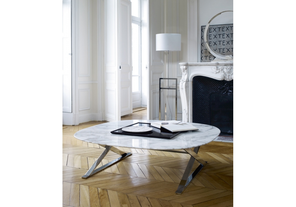 Pathos diseñada por Antonio Citterio para Maxalto es una mesita con tablero de mármol, disponible en múltiples acabados. Estructura en acero cromado brillante o pintado níquel bronceado.