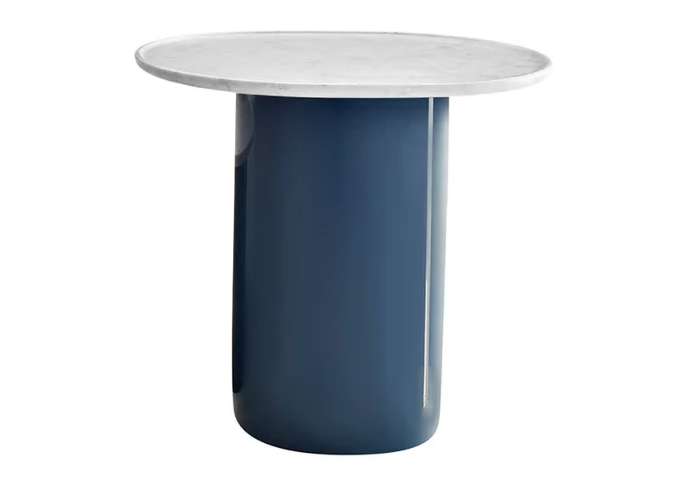 Button Tables, diseñado por Edward Barber & Jay Osgerby para B&B Italia, es una colección de mesas bajas. Mesas multipropósito con bases cilíndricas lacadas que se estrechan ligeramente en la parte inferior suavizando su geometría. Hay dos variantes ovales acompañadas por una tercera con forma redonda. Todos tienen una tapa de mármol con un borde elevado que se asemeja a una bandeja.