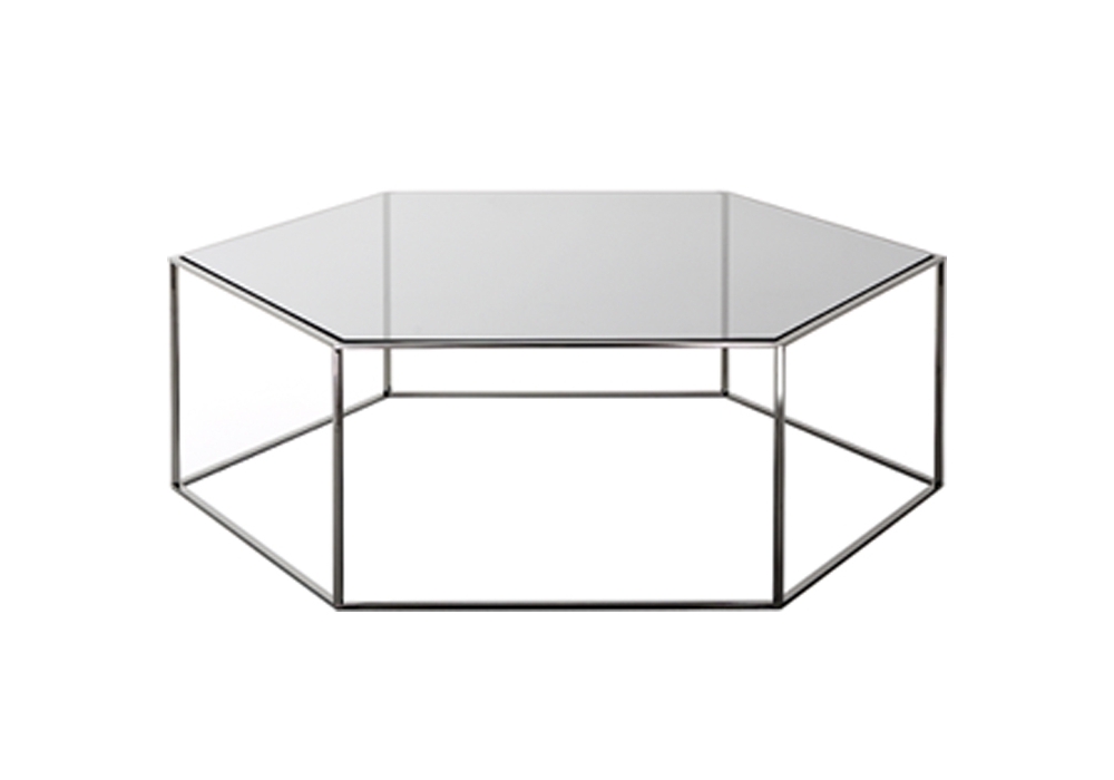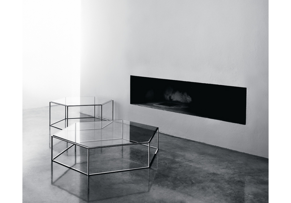 Hexagon 690 diseñada por Tokujin Yoshioka para Desalto es una mesita con estructura de acero, columnas hexagonales de acero, tapa de vidrio templado o cerámica. Disponible en diferentes acabados y tamaños.