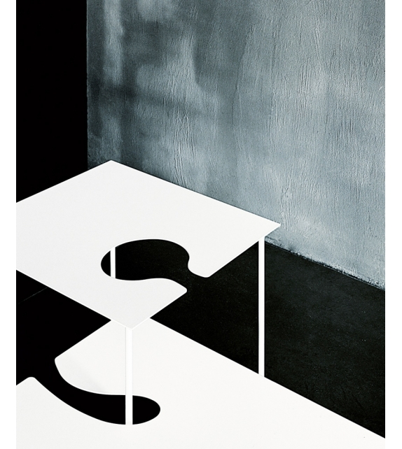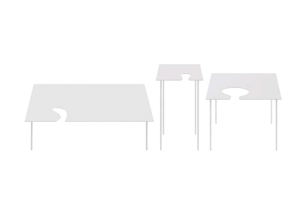 Softer Than Steel 688 diseñada por Nendo para Desalto es una mesita con tapa de chapa y patas de varilla de acero. Disponible en diferentes acabados y tamaños.