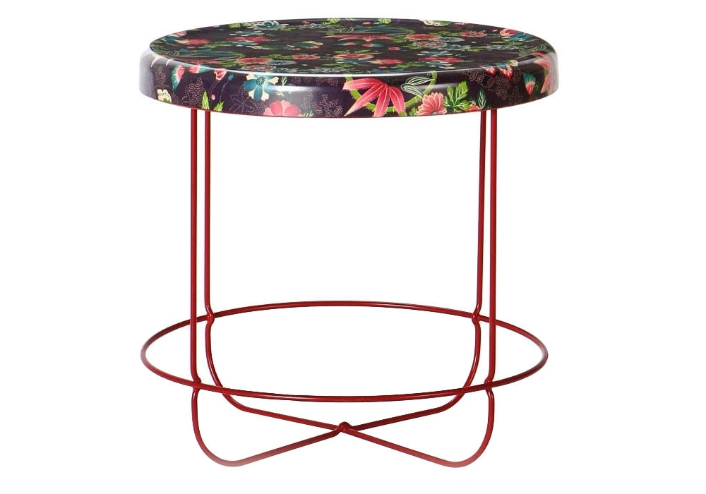 Ukiyo diseñada por Tomita Kazuhiko para Moroso es una mesa auxiliar con estructura de alambre de acero rojo RAL 3003 y tablero en tejido tradicional Kimono coestampado con resina de poliéster. La parte inferior del tablero está lacada a mano.