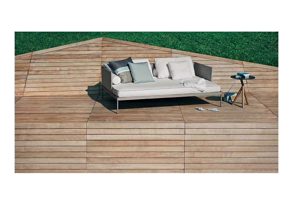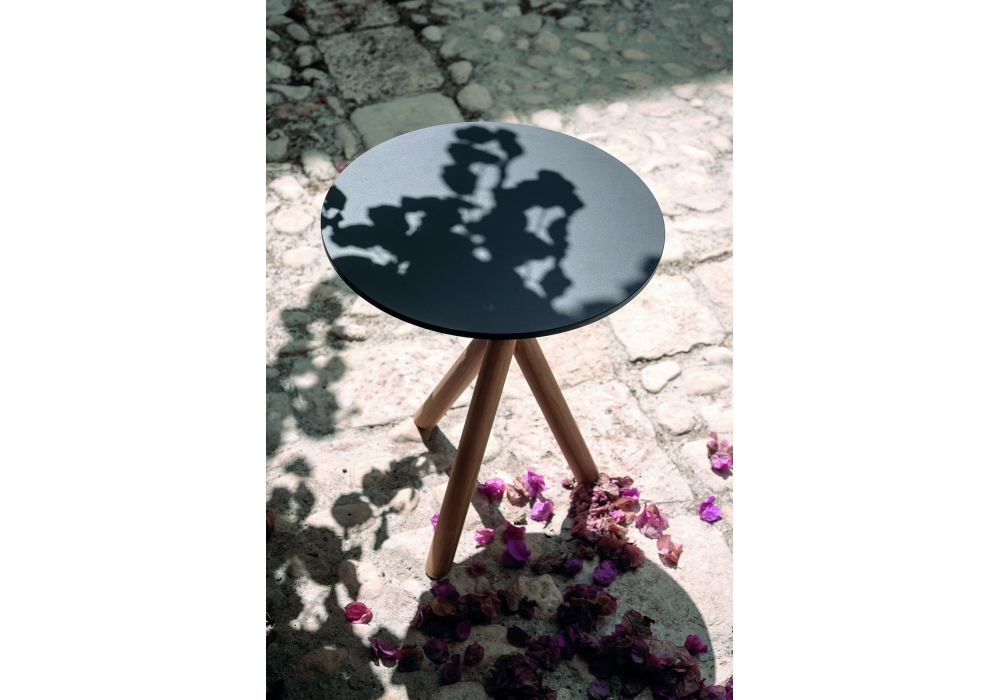 Stork diseñada por Gordon Guillaumier para Roda es una mesita para exterior compuesta por una base de teca y una tapa de gres.