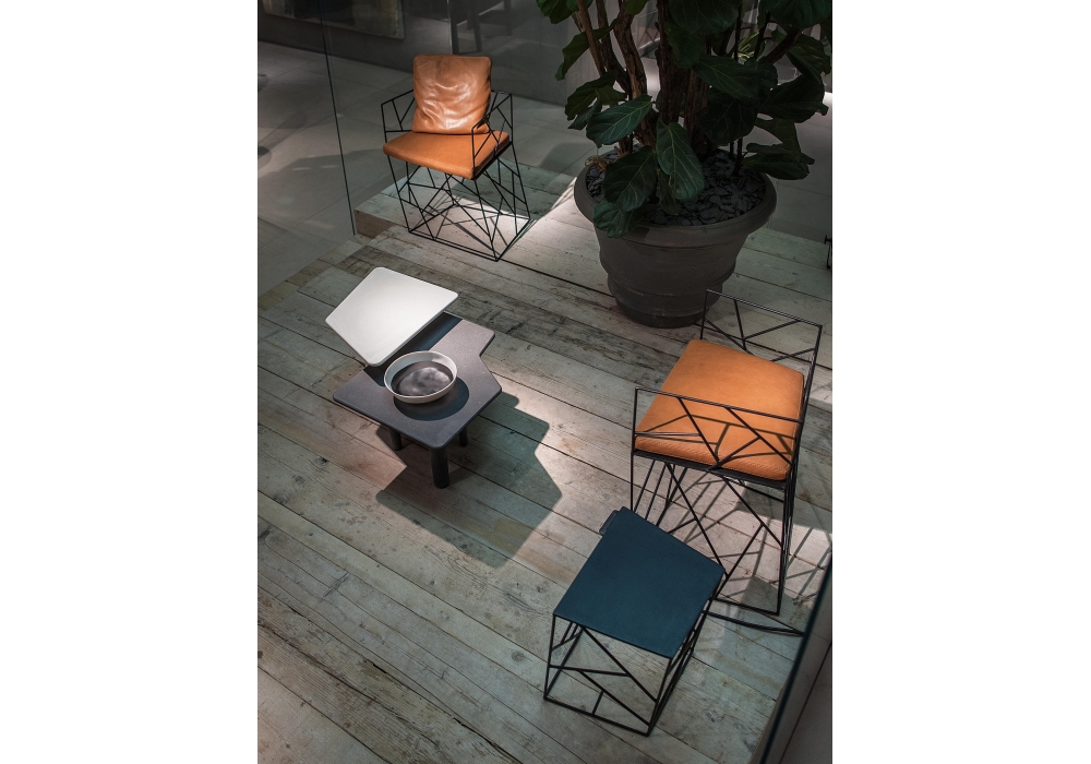 Craklé firmada por Antonino Sciortino para Baxter es una colección de mesitas para uso en el exterior. Estructura de metal galvanizado pintado negro mate.