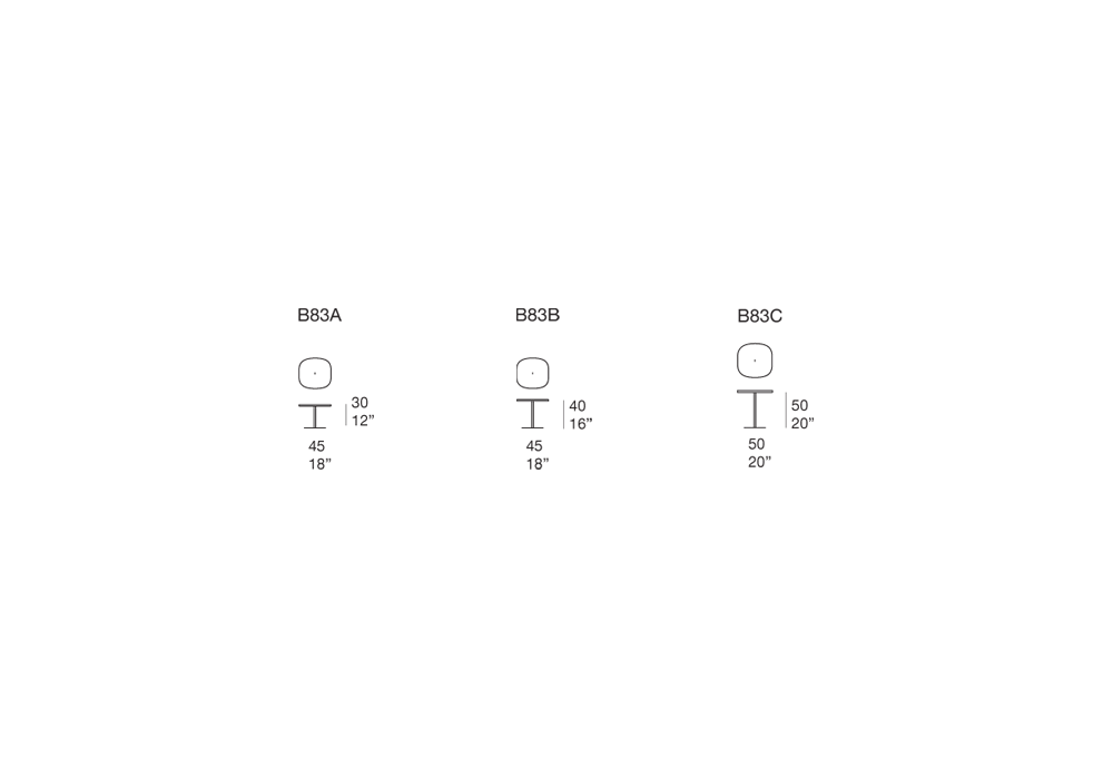 | Dimensiones | Ø 45 x H 30 cm (B83A); Ø 45 x H 40 cm (B83B); Ø 50 x H 50 cm (B83C). |