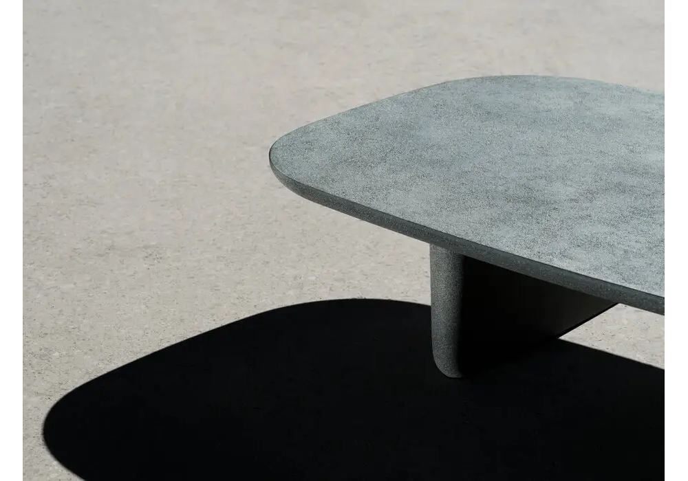 Tobi-Ishi diseñada por Edward Barber & Jay Osgerby para B&B Italia Outdoor es una mesa baja disponible en cemento gris o antracita. El sobre es tratado con un producto de impregnación que lo hace permeable al aire pero lo protege del agua.