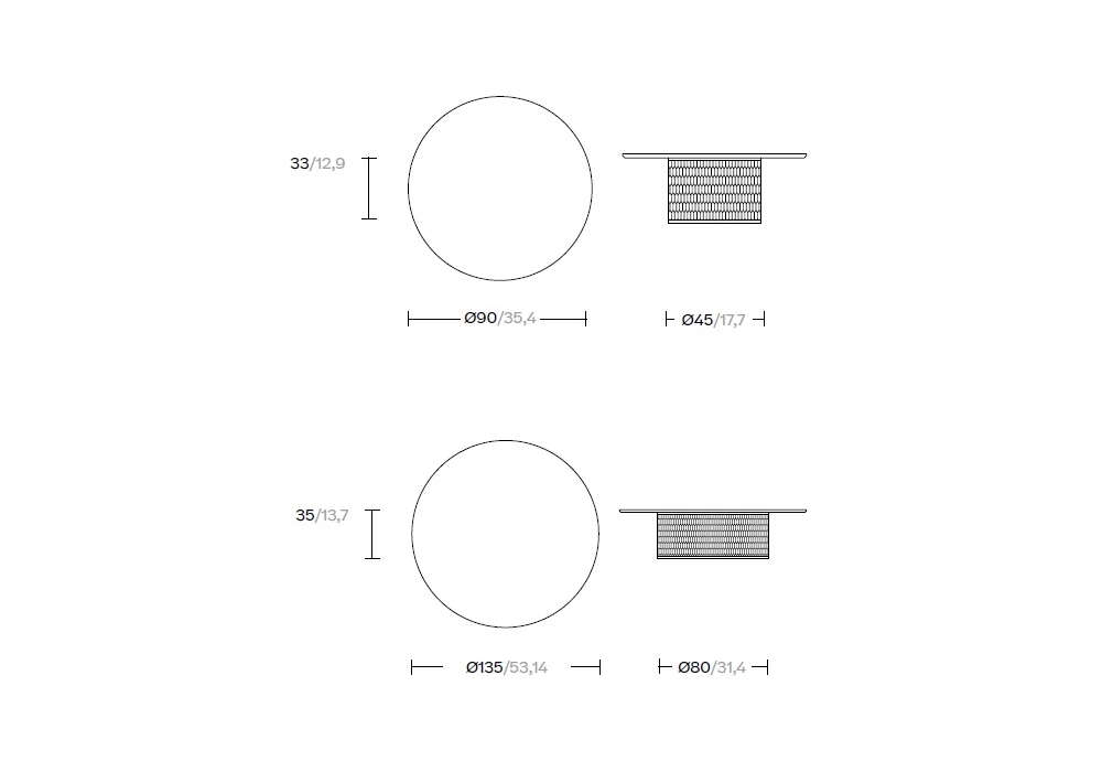 | Dimensiones | Ø 90 x H 33 cm; Ø 135 x H 35 cm. |