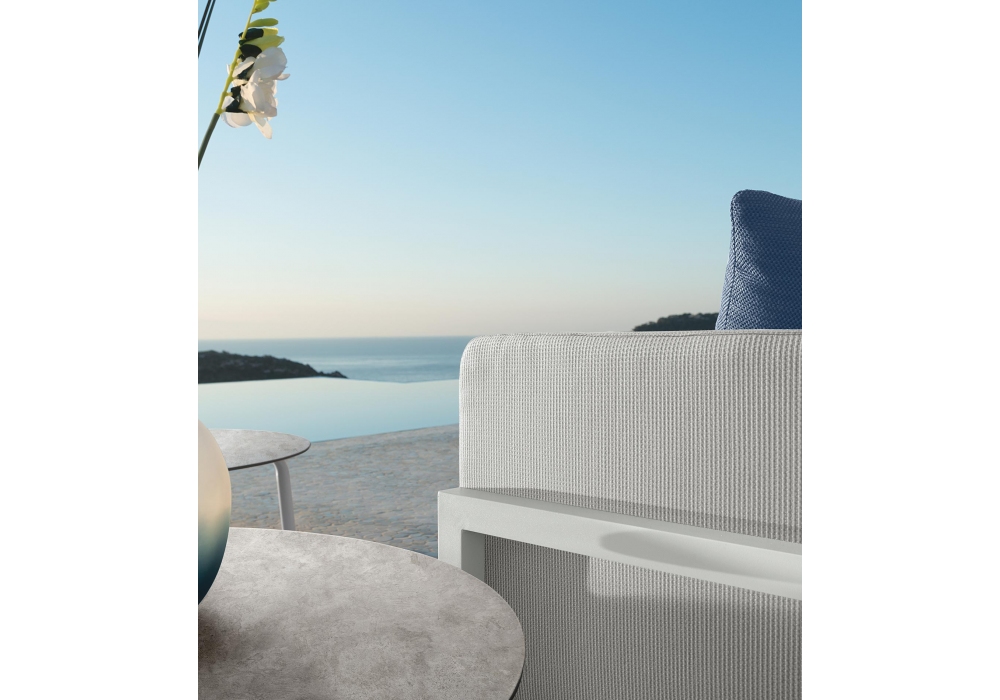 Cleosoft//Alu diseñada por Marco Acerbis para Talenti es una mesa baja con estructura en aluminio blanco o grafito y sobre en fibrocemento gris claro u oscuro.