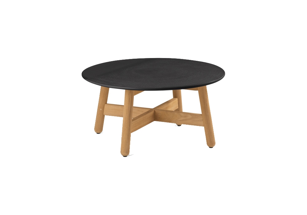 La colección Mbrace diseñada por Sebastian Herkner para Dedon viene en una mezcla de materiales. La mesita está en una base de teca con una mesa de cerámica disponible en 3 acabados.