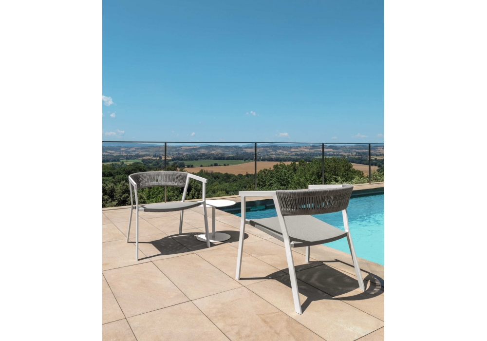 Key diseñada para Talenti es una mesa de centro redonda con estructura de aluminio, disponible en dos acabados y tamaños.