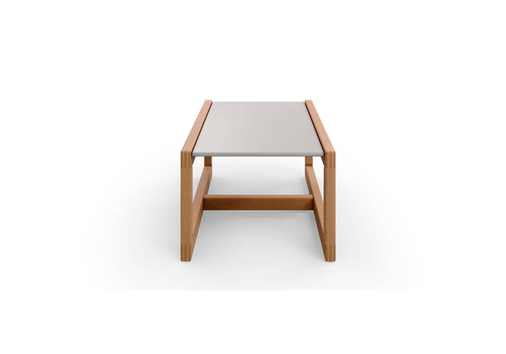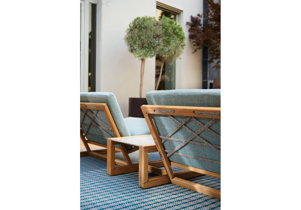 Carlotta diseñada por Tobia Scarpa para Cassina es una mesita de exterior realizada con estructura en madera maciza de teca natural y tapa en gres porcelánico esmaltado gris o marfil. Disponible en diferentes dimensiones.