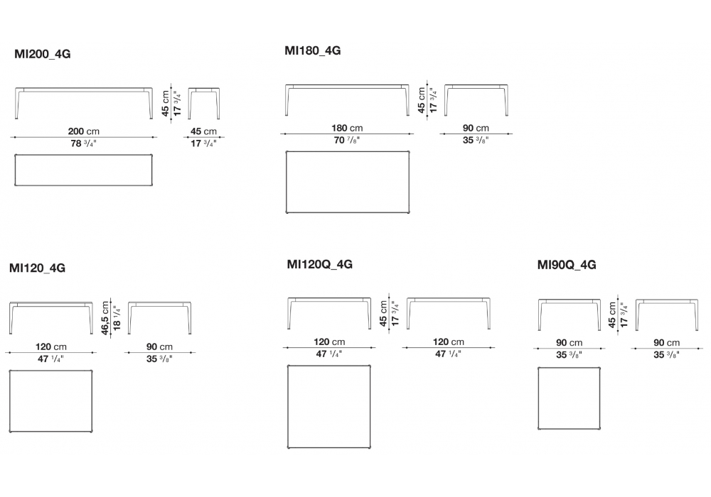 | Dimensiones | 90 x 90 x H 45 cm; 120 x 120 x H 45 cm; 120 x 90 x H 46.5 cm; 180 x 90 x H 45 cm; 200 x 45 x H 45 cm. |