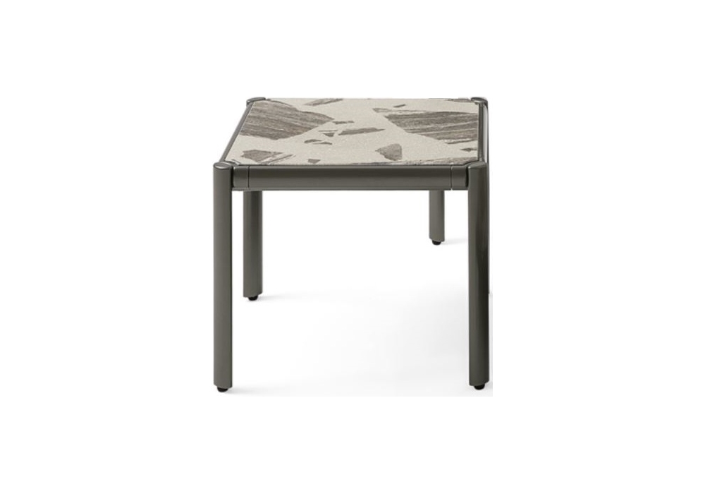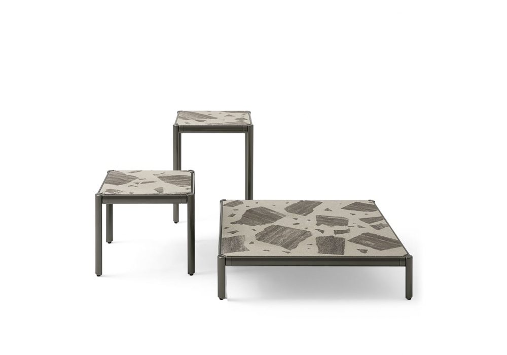 Aldìa diseñada por Carlo Colombo para Giorgetti es una mesita con estructura de metal pintado Pewter y tapa disponible en las siguientes versiones: Palladiana, formada por fragmentos de diferentes tamaños de mármol travertino de nogal incrustados en minúsculas partículas de polvo de mármol; grano diminuto en variantes de toba y piedra caliza. La mesa de centro está disponible en diferentes tamaños.