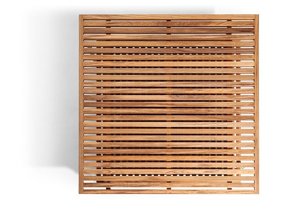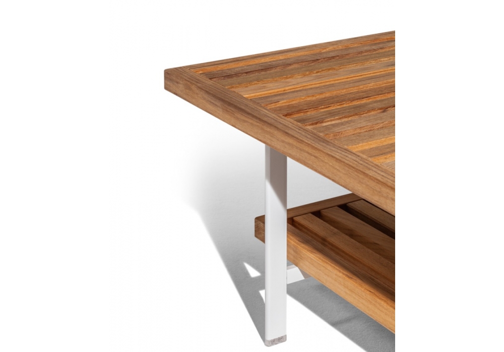Solaria diseñada por Ludovica + Roberto Palomba para Poltrona Frau es una mesita en madera maciza de teca en acabado natural y base en acero inoxidable, con recubrimiento en polvo color tiza. También disponible en 2 versiones: con superficie simple o doble.