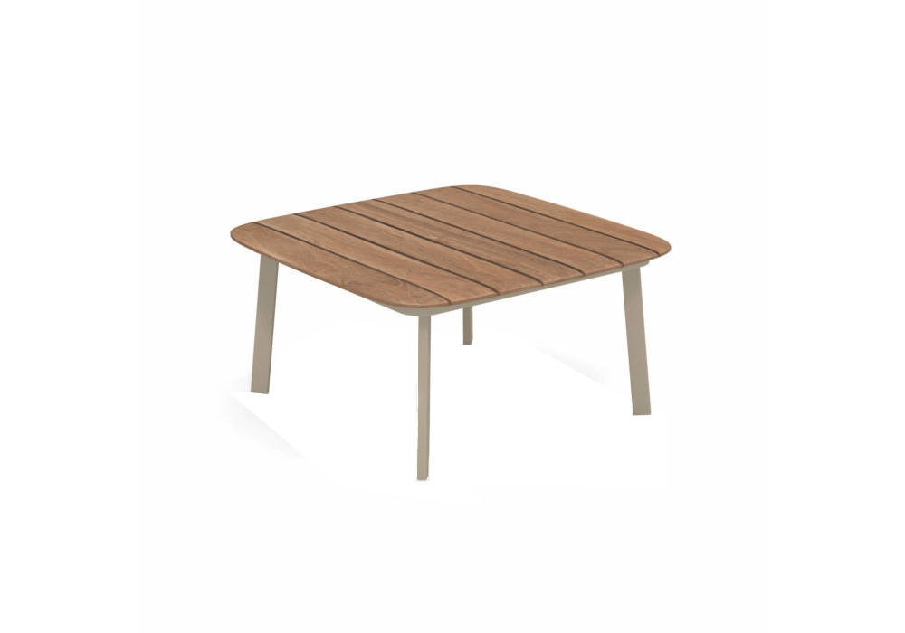 Shine diseñada por Arik Levy para Emu es una mesa de estilo moderno con estructura en aluminio pintado y tablero en Teca.