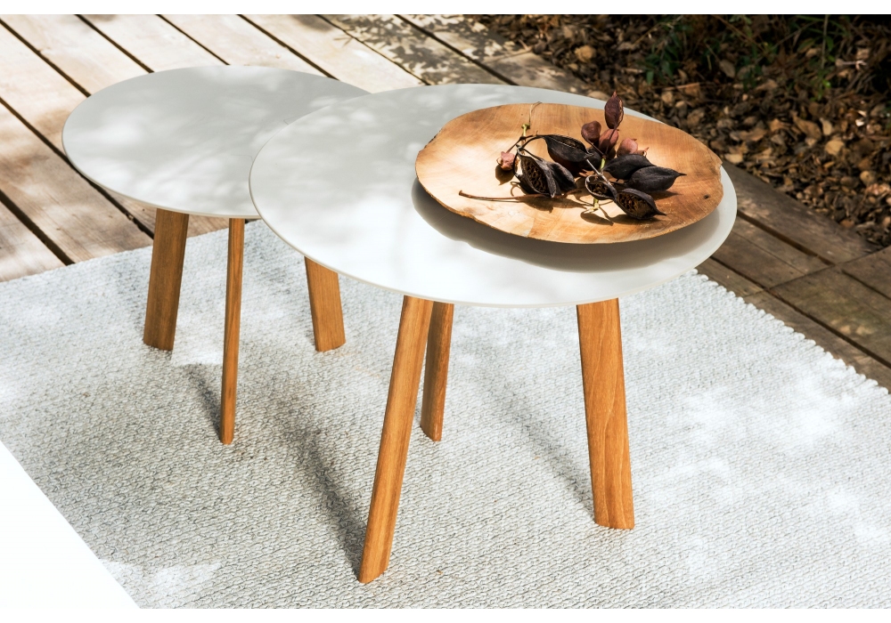 Ile diseñada y producida por Tribù es una mesa de centro con patas en teca y tapa en aluminio lacado en diferentes acabados. La mesa está disponible en varios tamaños.