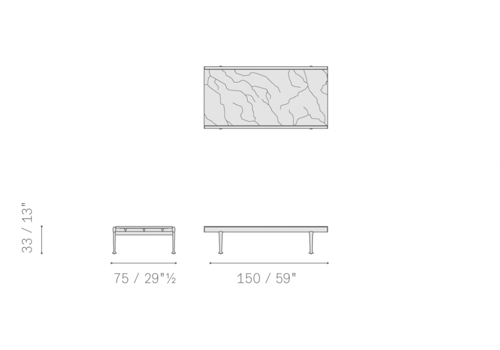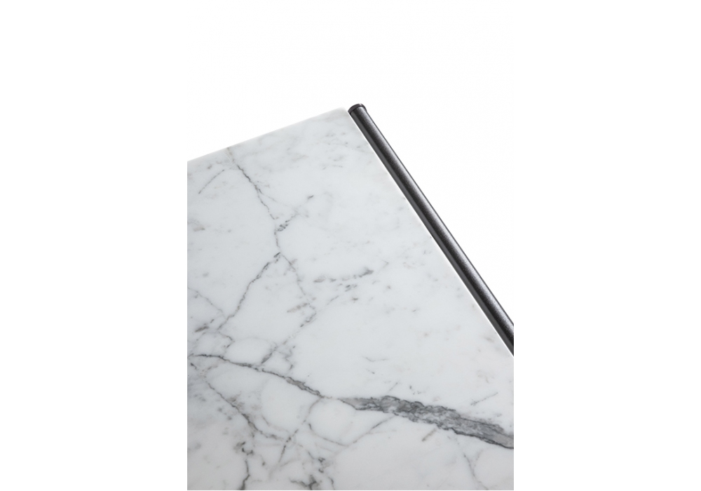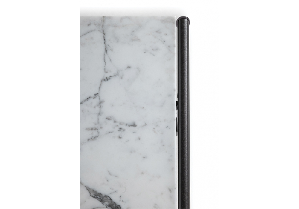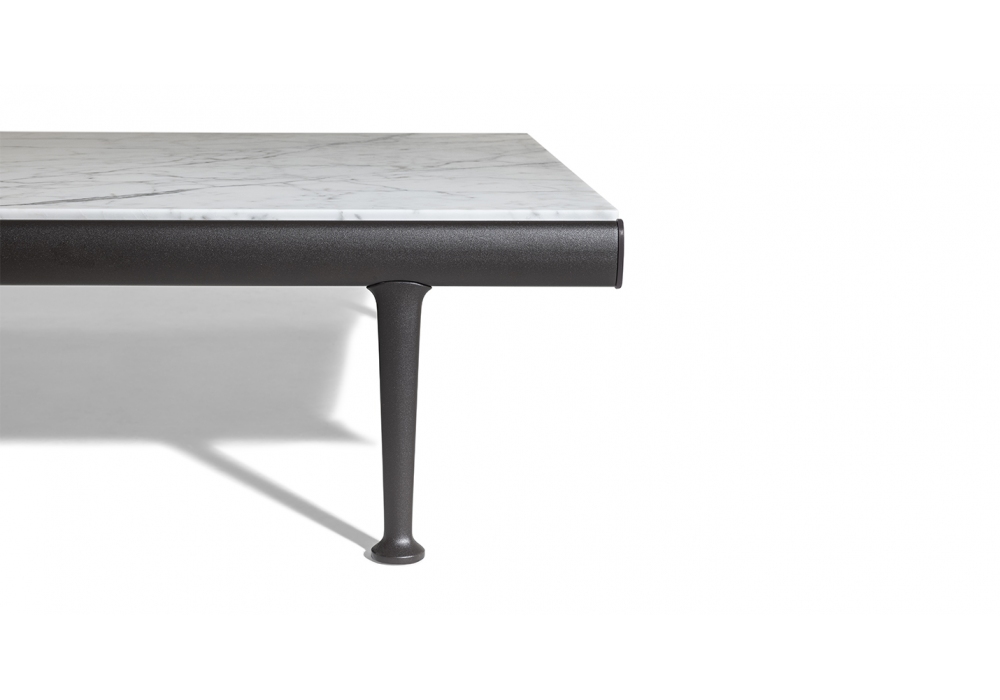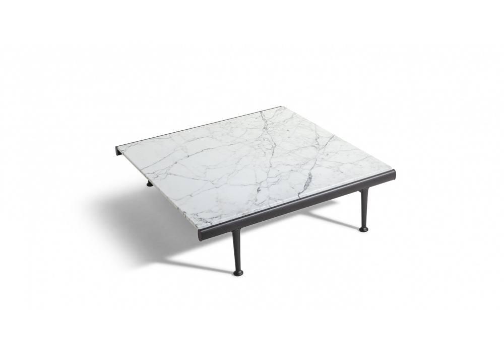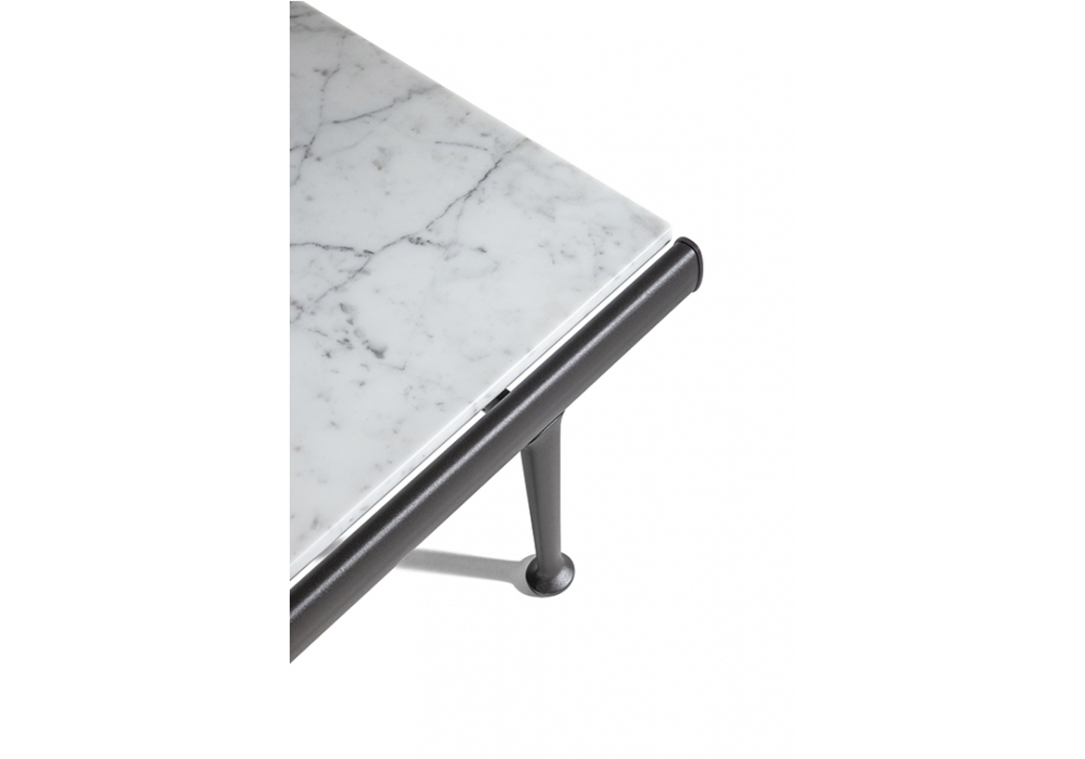 Souvenir d'Italie diseñada por Ludovica & Roberto Palomba para Poltrona Frau es una mesita de exterior con tablero en mármol Arabescato veteado con acabado natural tratado con cera protectora hidrófuga y estructura de aluminio.