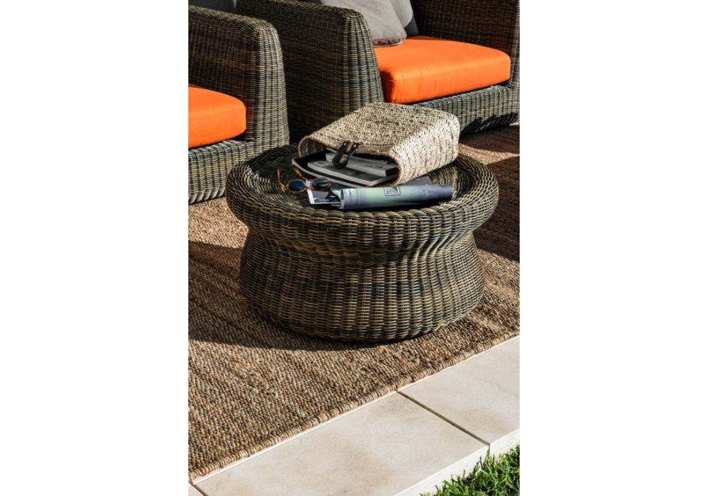 Agorà producida y firmada por Unopiù es una mesa de centro circular con estructura de aluminio y carcasa de fibra sintética waprolace tejida a mano. La parte superior es de cristal. Agorà está disponible en diferentes tamaños.