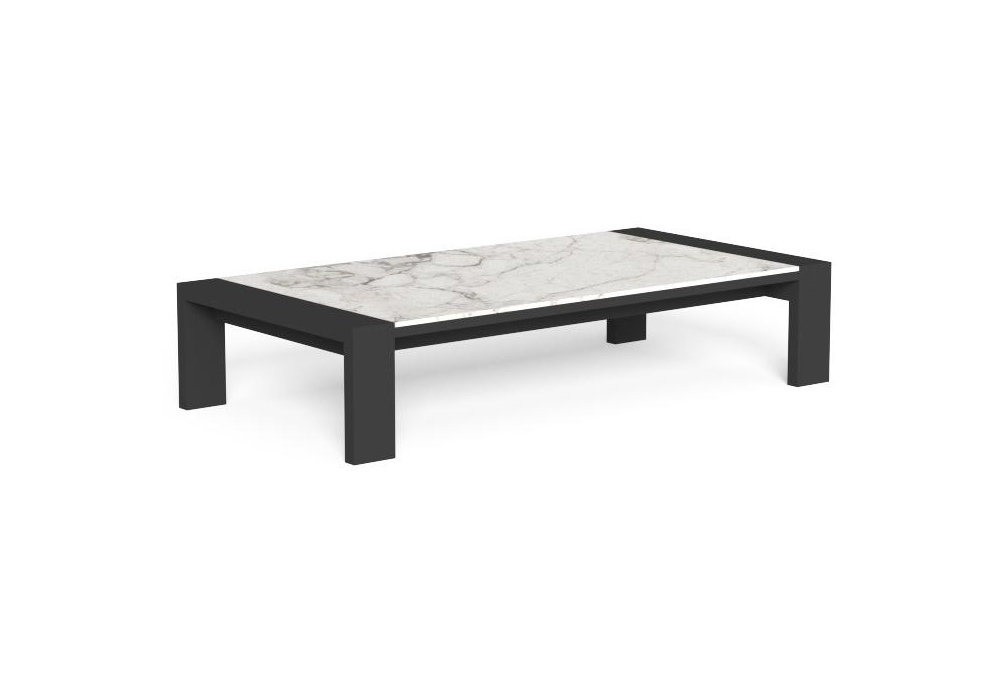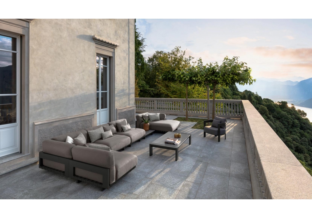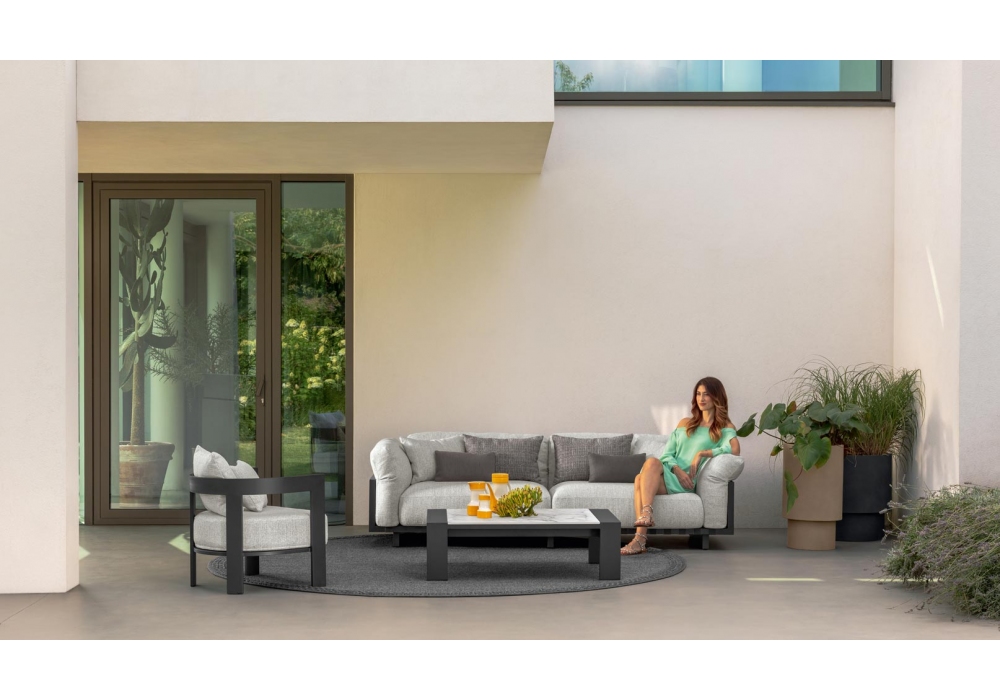 Argo Alu diseñada por Ludovica + Roberto Palomba para Talenti es una colección de mesas de centro para exterior con base de aluminio y tapa de gres.