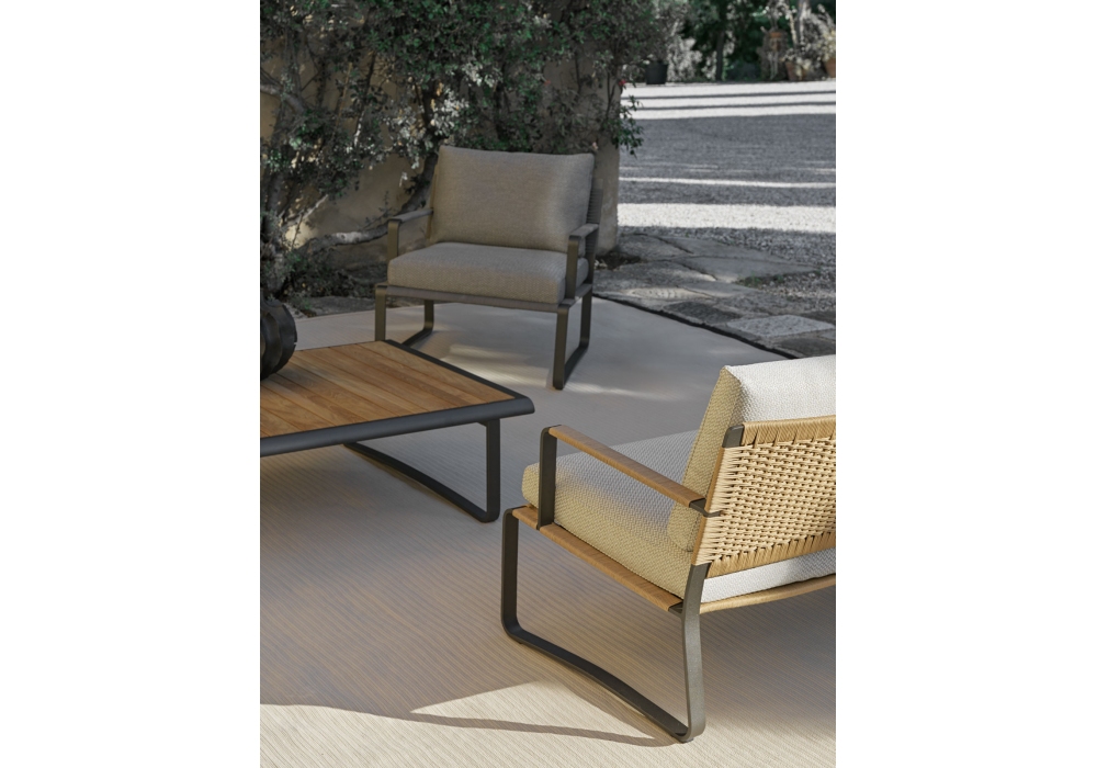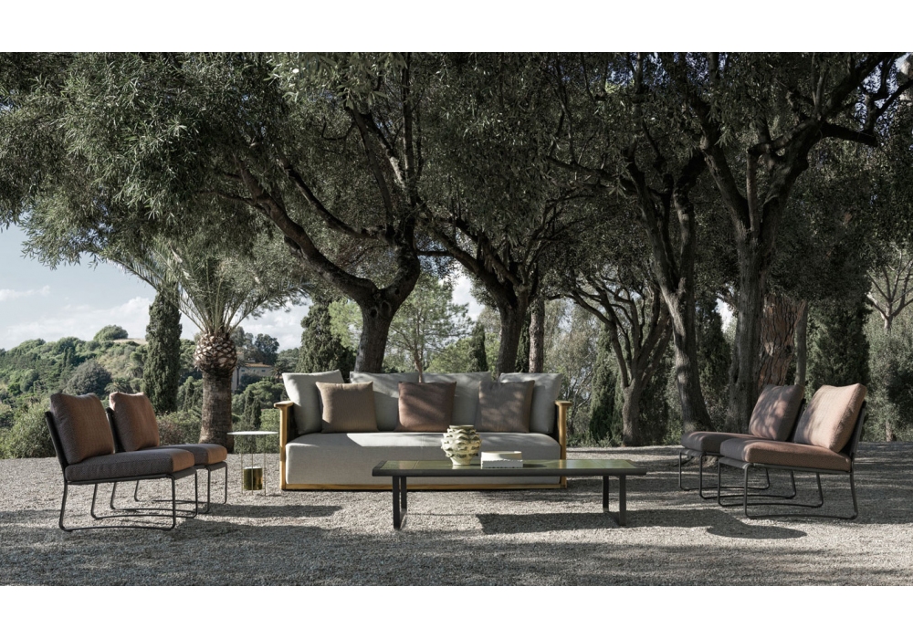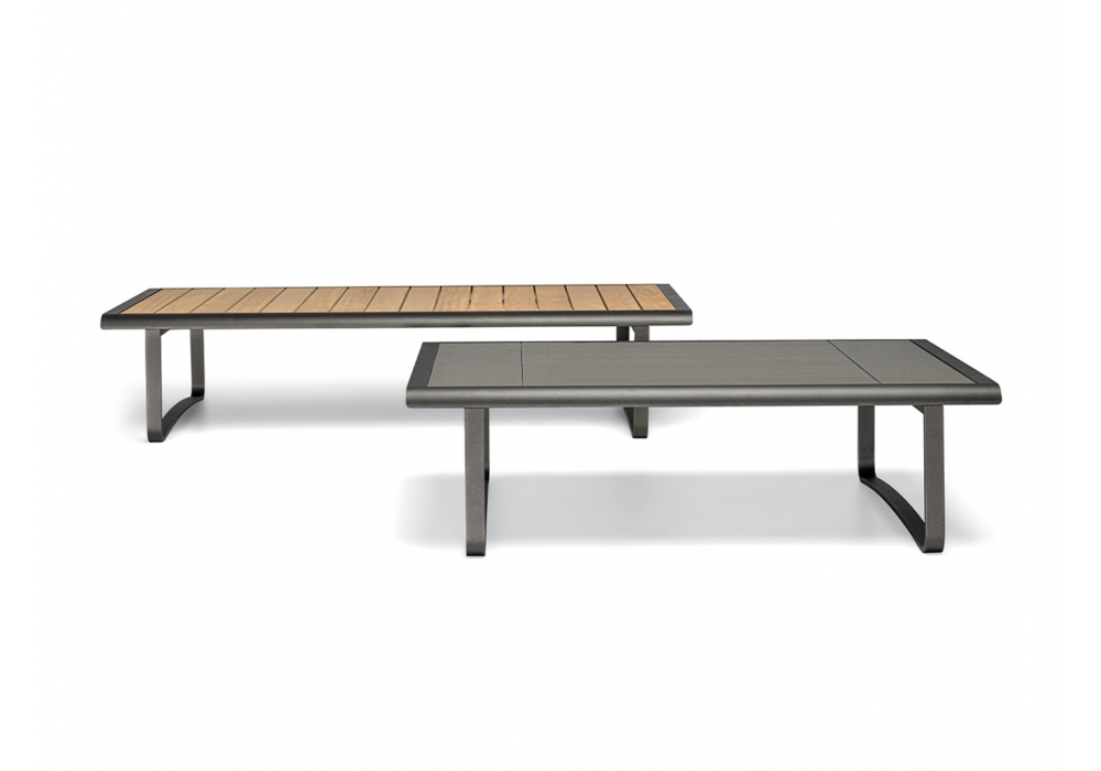 Phoenix diseñada por Vincent Van Duysen para Molteni&C es una mesita de exterior realizada con estructura en metal bruñido y tablero en piedra de lava o teca. Disponible en diferentes acabados y dimensiones.