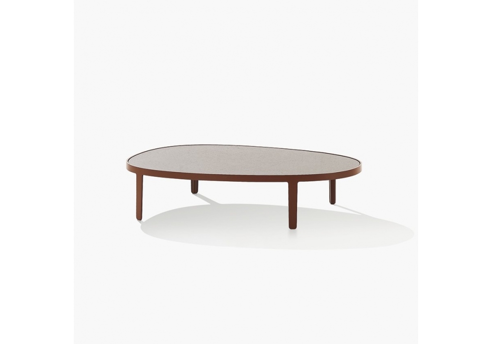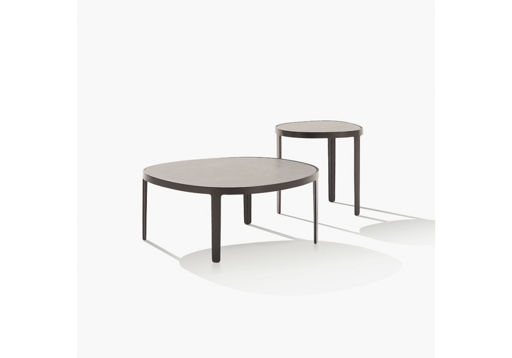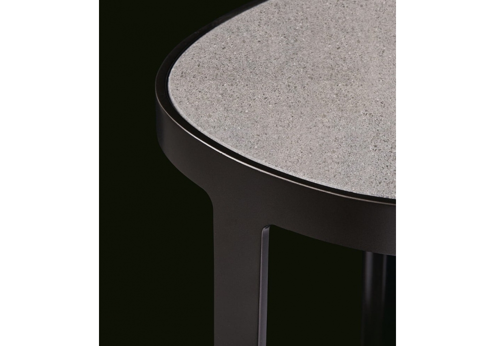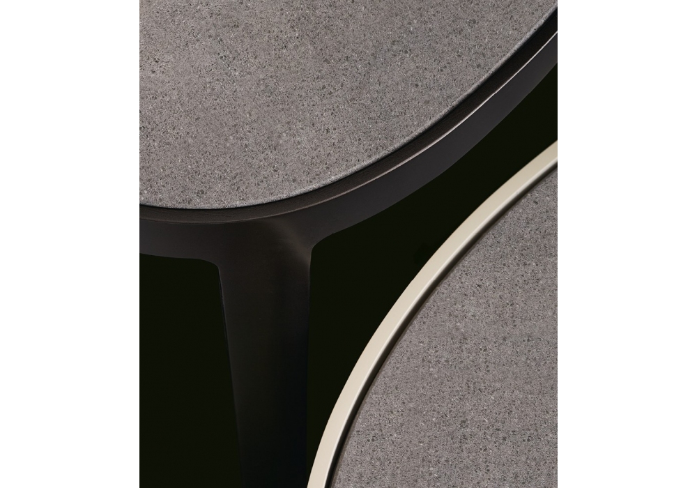Mad Out diseñada por Marcel Wanders para Poliform es una mesita con estructura de aluminio pintado mate y tapa de piedra de lava, también disponible con decoración de vidrio fundido.
