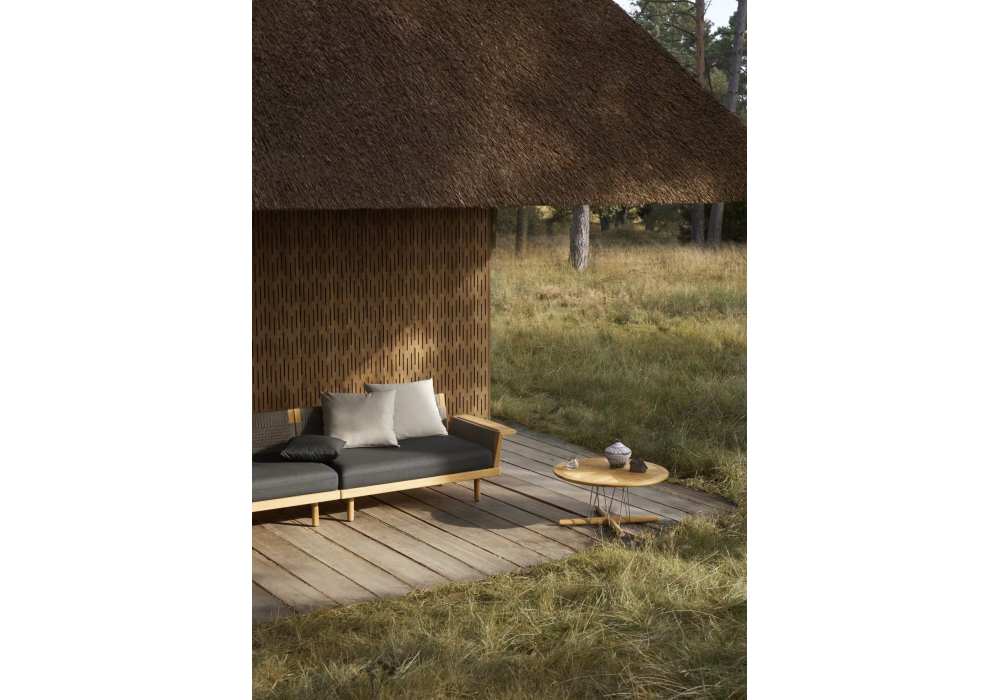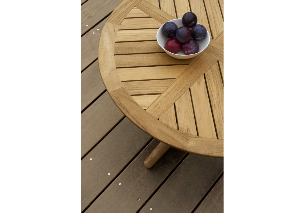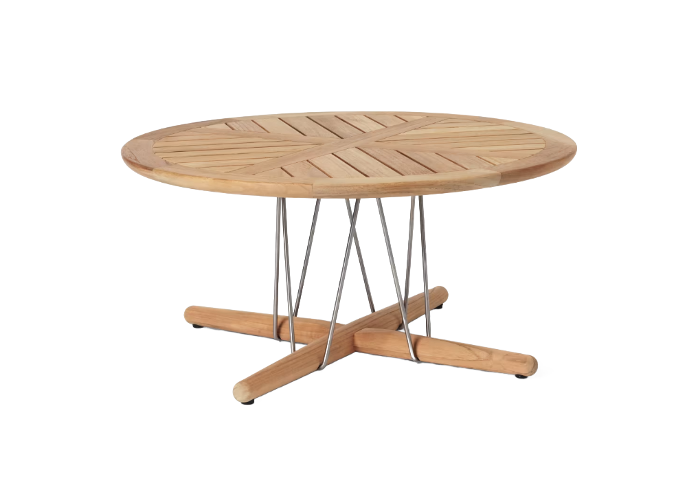E023 Embrace diseñada por Eoos para Carl Hansen & Søn es una mesita para exterior con tablero y base de madera maciza de teca sin tratar. Estructura de acero inoxidable.