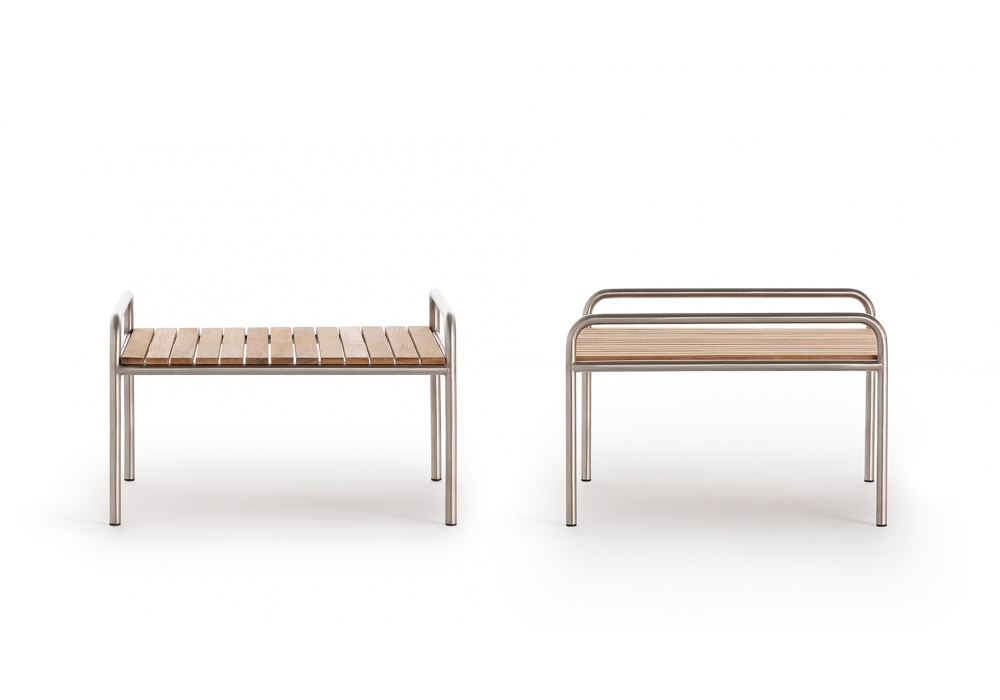 Onsen Mesita diseñada por Francesco Meda y David Quincoces para Gandia Blasco está fabricada con una estructura tubular en acero inoxidable natural o lacado, el tablero revestido en aluminio termolacado o en lamas de madera de iroko, una madera con grandes cualidades para su uso en exterior. Disponible en diferentes acabados.