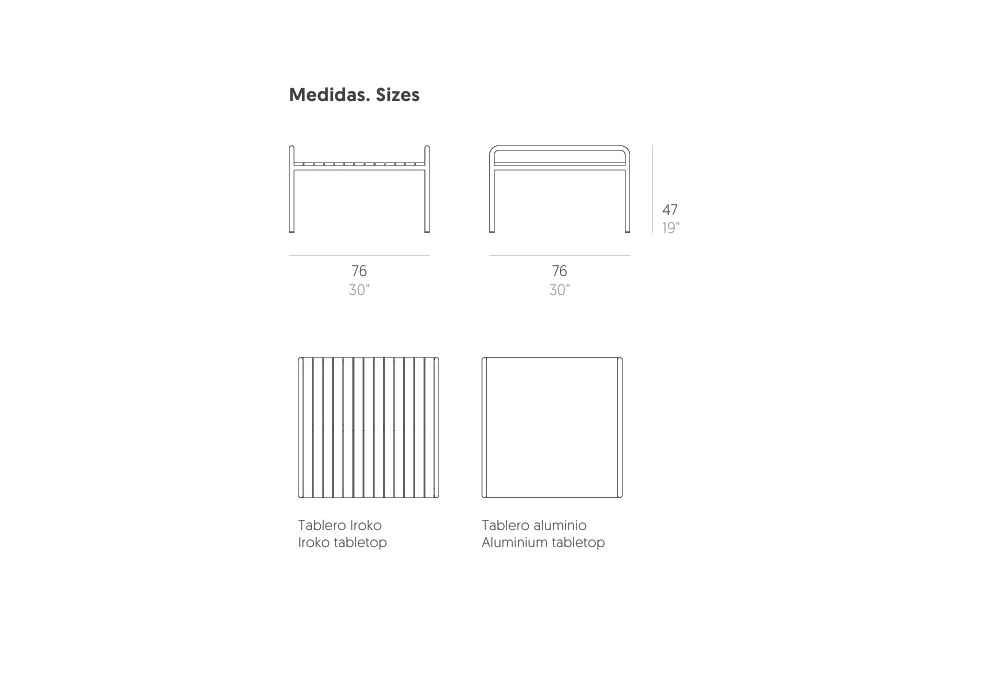 | Dimensiones | 76 x 76 x H 47 cm; 153 x 66 x H 37 cm. |