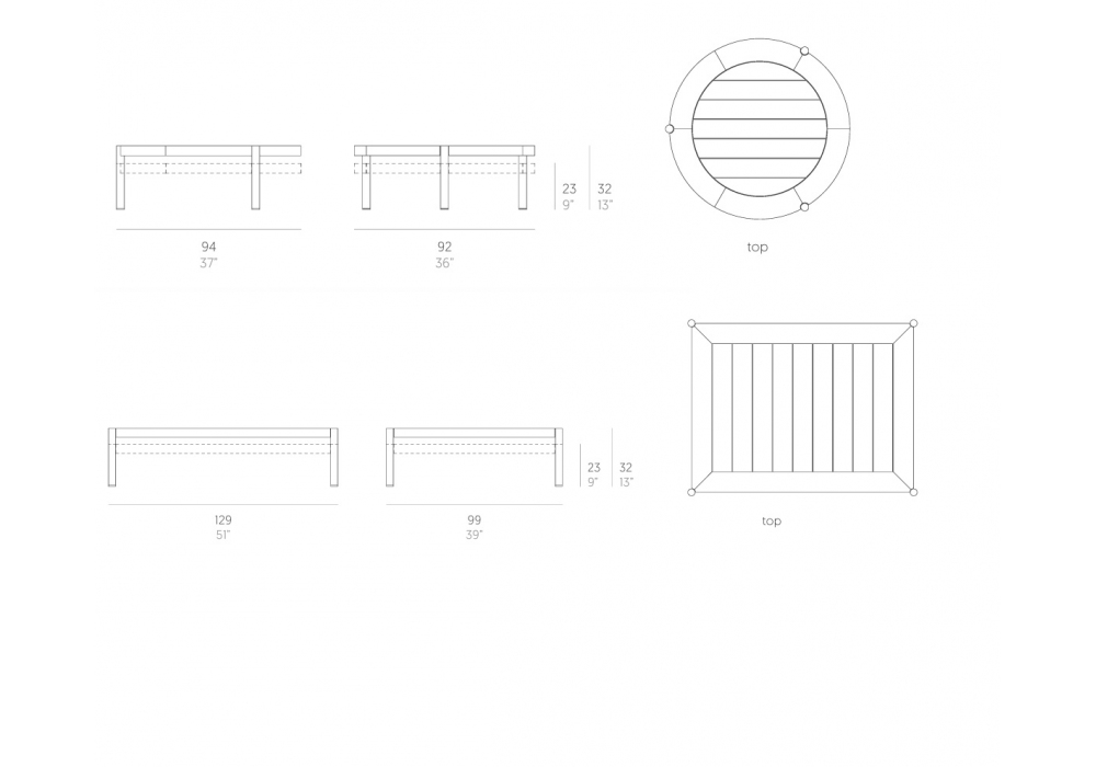 | Dimensiones | Ø 94 x 92 x H 23 cm; Ø 94 x 92 x H 32 cm; 129 x 99 x H 23 cm; 129 x 99 x H 32 cm. |