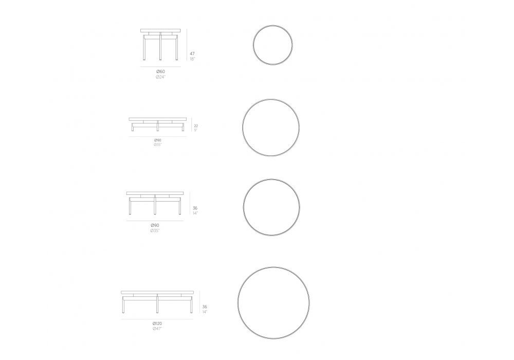 | Dimensiones | Ø 60 x H 47 cm; Ø 90 x H 22 cm; Ø 90 x H 36 cm; Ø 120 x H 36 cm. |