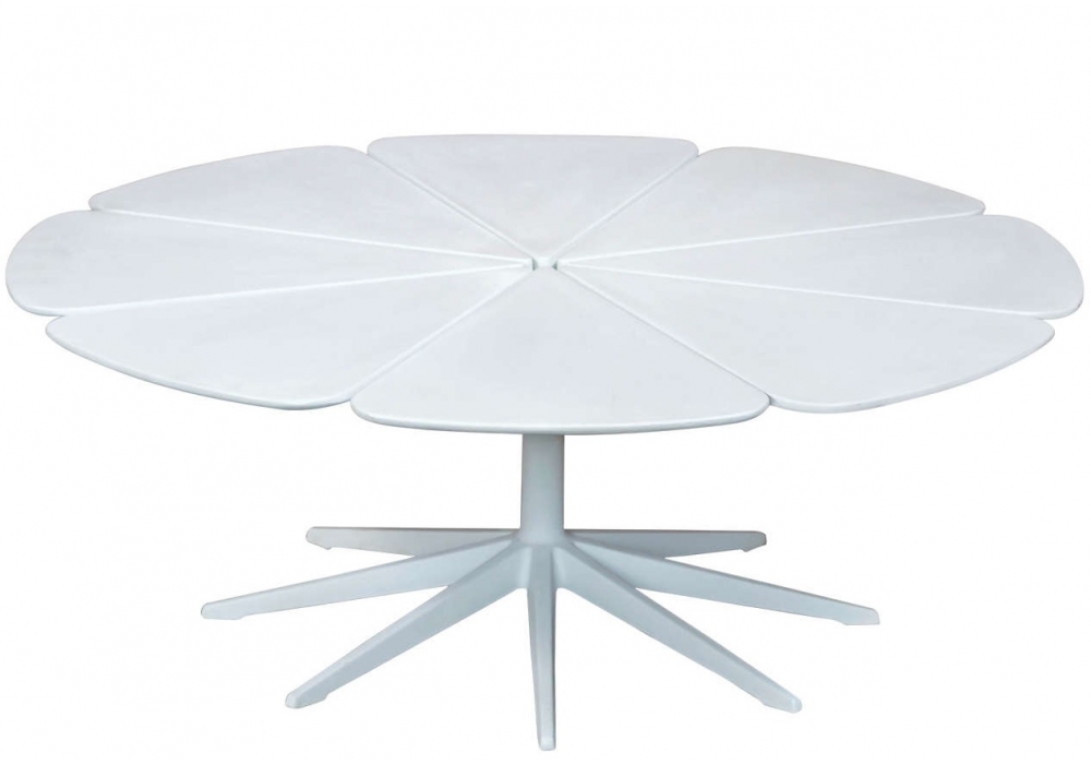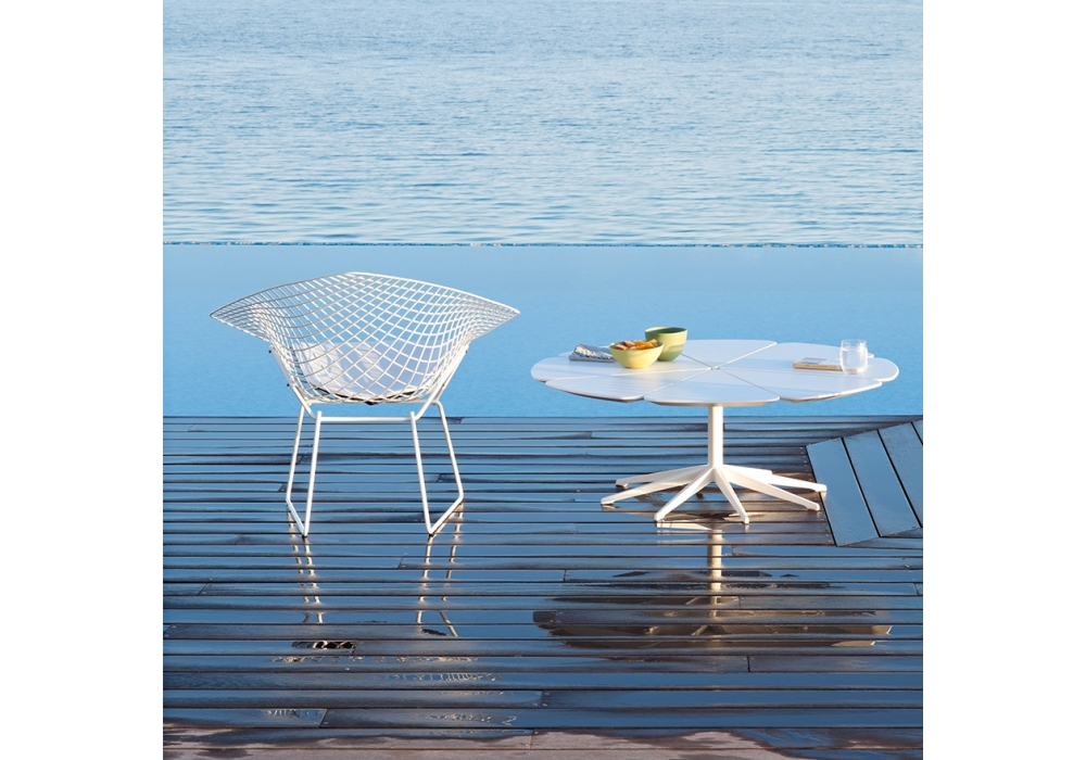 Petal, diseñada por Richard Shultz para Knoll, es una mesa de centro para exteriores con estructura de aluminio fundido a presión con revestimiento en polvo blanco y pata central de acero inoxidable pintado. Tablero de poliuretano de alta densidad blanco o teca.