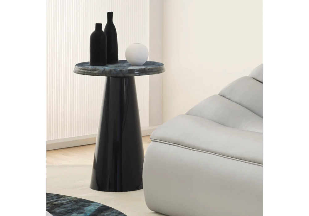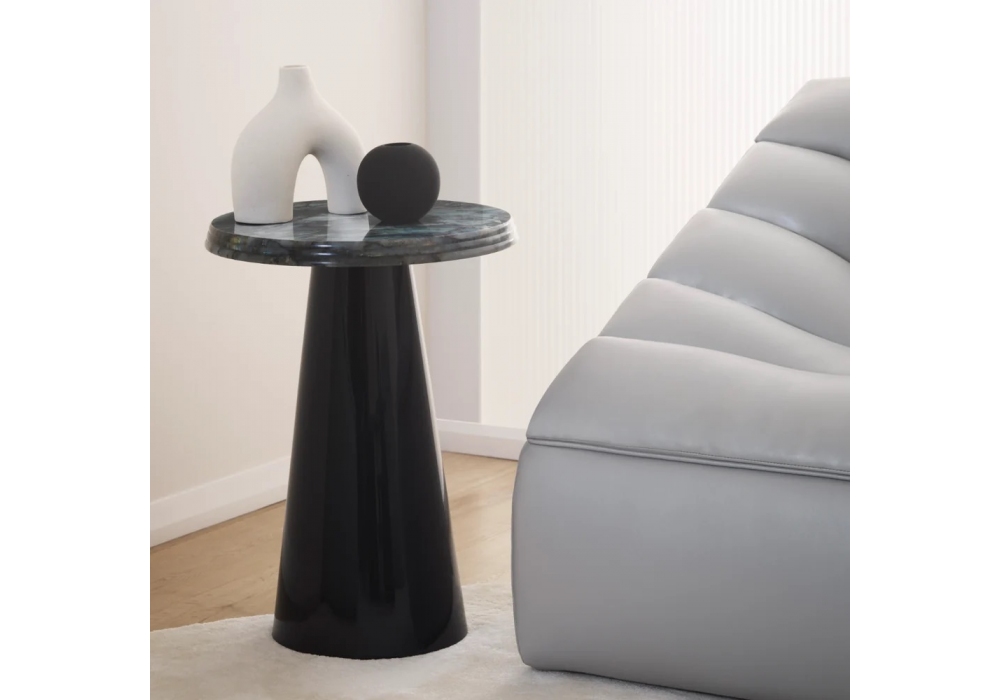 Wellen diseñada por Toan Nguyen para Karl Lagerfeld Maison es una mesa auxiliar con tablero disponible en mármol o en acabado lacado y base lacada.