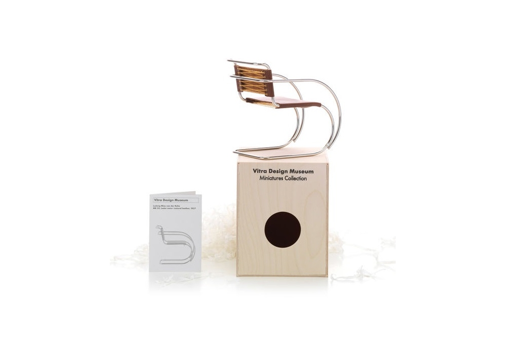 Vitra Miniature MR 20, Mies Van Der Rohe: Miniatures Collection: La "Miniatures Collection" del Museo Vitra Design abarca objetos clave de la historia internacional del diseño de 1850 hasta hoy. Todas las miniaturas son réplicas exactas de los originales en cuanto a construcción, material y color. Las técnicas de fabricación fueron adaptadas en un esmerado proceso de desarrollo a las exigencias de la miniaturización. Gracias a esta fidelidad al original, las miniaturas no sólo son un objeto de coleccionista para los aficionados a los muebles, sino también un material ilustrativo ideal para universidades y escuelas de diseño. Ya pueden obtenerse más de 80 modelos a escala 1:6 y la colección es desarrollada continuamente. Todos los modelos vienen embalados en una pequeña caja de madera acompañados de un folleto que explica el diseño. Los ingresos netos de la venta de miniaturas son destinados a las exposiciones y los talleres del Museo Vitra Design.