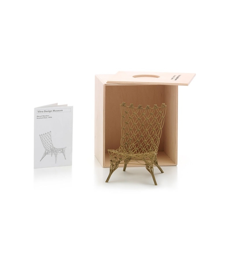 Vitra Miniature Knotted chair, Wanders: Miniatures Collection: La "Miniatures Collection" del Museo Vitra Design abarca objetos clave de la historia internacional del diseño de 1850 hasta hoy. Todas las miniaturas son réplicas exactas de los originales en cuanto a construcción, material y color. Las técnicas de fabricación fueron adaptadas en un esmerado proceso de desarrollo a las exigencias de la miniaturización. Gracias a esta fidelidad al original, las miniaturas no sólo son un objeto de coleccionista para los aficionados a los muebles, sino también un material ilustrativo ideal para universidades y escuelas de diseño. Ya pueden obtenerse más de 80 modelos a escala 1:6 y la colección es desarrollada continuamente. Todos los modelos vienen embalados en una pequeña caja de madera acompañados de un folleto que explica el diseño. Los ingresos netos de la venta de miniaturas son destinados a las exposiciones y los talleres del Museo Vitra Design.