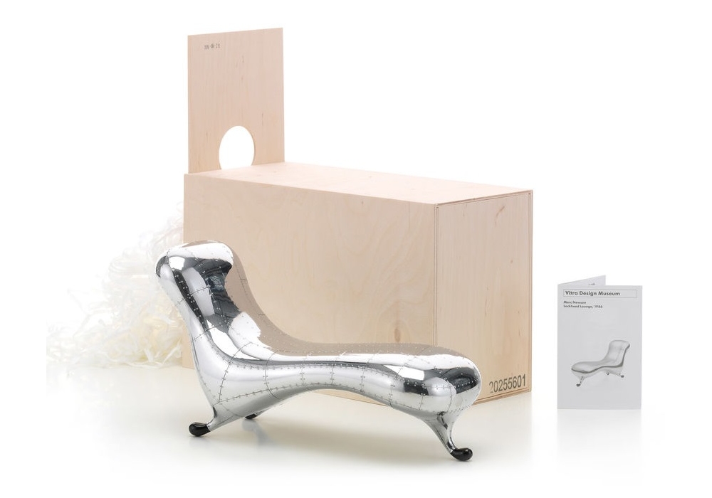 Vitra Miniature Lockheed, Newson: Miniatures Collection: La "Miniatures Collection" del Museo Vitra Design abarca objetos clave de la historia internacional del diseño de 1850 hasta hoy. Todas las miniaturas son réplicas exactas de los originales en cuanto a construcción, material y color. Las técnicas de fabricación fueron adaptadas en un esmerado proceso de desarrollo a las exigencias de la miniaturización. Gracias a esta fidelidad al original, las miniaturas no sólo son un objeto de coleccionista para los aficionados a los muebles, sino también un material ilustrativo ideal para universidades y escuelas de diseño. Ya pueden obtenerse más de 80 modelos a escala 1:6 y la colección es desarrollada continuamente. Todos los modelos vienen embalados en una pequeña caja de madera acompañados de un folleto que explica el diseño. Los ingresos netos de la venta de miniaturas son destinados a las exposiciones y los talleres del Museo Vitra Design.